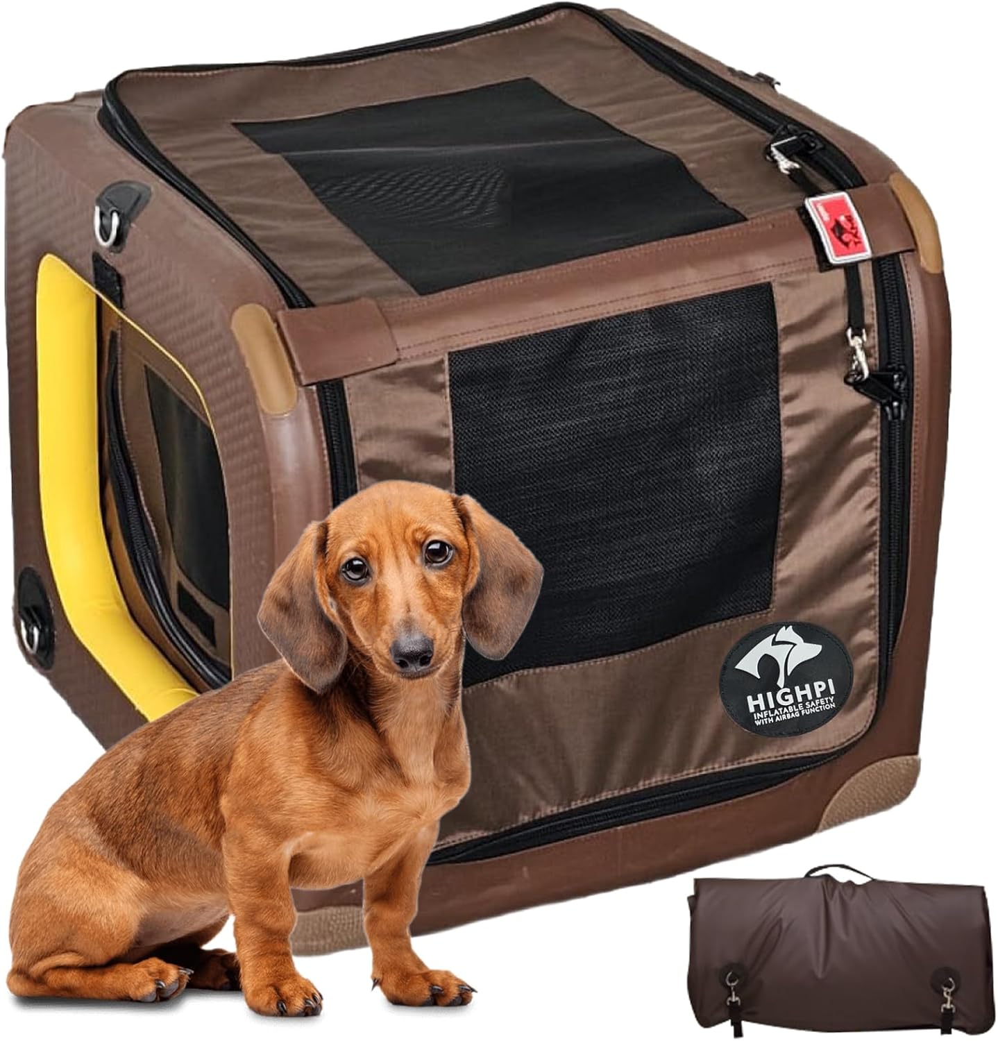 • AIRBAG AIR COMFOR FLOOR CUSHIONING: HIGHPI inflatable soft back seat dog crate for car offers "airbag function" to maximum impact safety for dogs during travel in case of emergency braking or sudden evasive movement. HIGHPI backseat dog travel crate have passed the crash test with flying colors! Your dog is protected by 4cm thick air chambers! This dog kennel has a sturdy inflatable 4cm thick floor which offers perfect cushioning and absolutely comfortable transport for your furry companion.