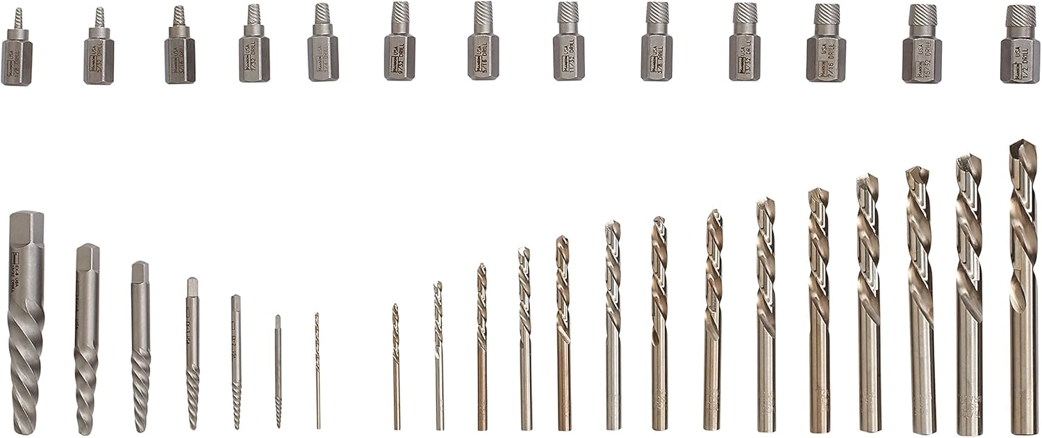 - Extractor size and recommended drill bit size are etched on each tool