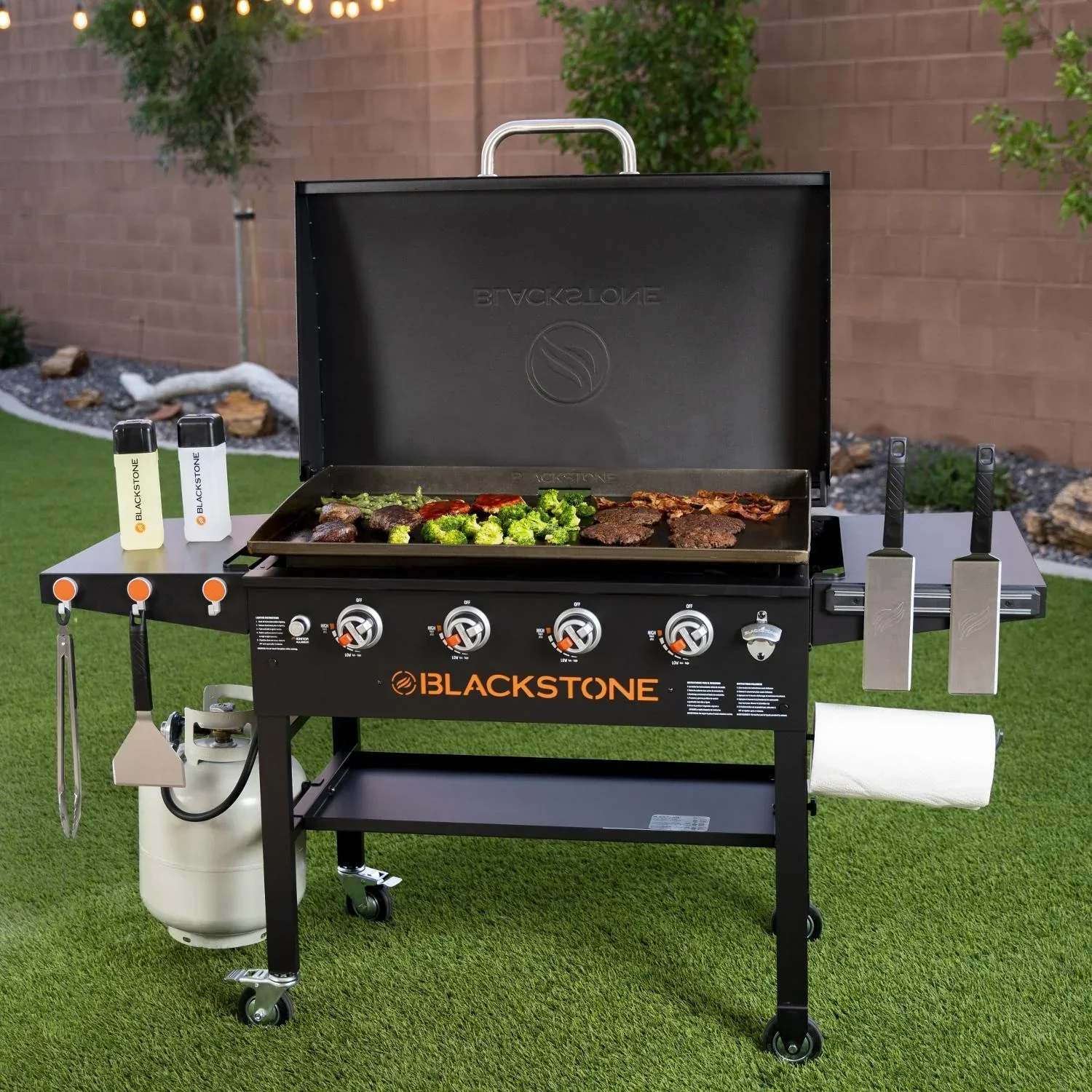 Get the Blackstone experience by cooking anything. anywhere. with this 36-inch griddle cooking station. With 769 square inches of space. you can cook for a crowd of any size. Four stainless steel burners provide 60.000 BTUs. giving you plenty of power to cook anything and providing even heat all over. The heavy duty 7-gauge rolled carbon steel griddle plate stands up to the toughest jobs and promises years of use out in the elements. For easy cleanup. Blackstone has implemented their own patented rear grease management system to provide no mess. hassle-free operation. The easy-to-use control knobs provide precise temperature control. letting you create up to 4 temperature zones while also getting you grilling quick with simple piezo ignition. Protect your griddle from dirt. damage. and the weather with the included hood. This hood secures to the rear of the griddle and lifts out of the way easily when cooking. Two folding side shelves provide plenty of prep space. as well as a full length bottom shelf for storage. The steel cart features two caster wheels and two fixed wheels for mobility and a 20 lb propane tank holder. To hold your accessories close at hand. a magnetic strip is featured on one shelf and tool hooks on the other. A cart-mounted paper towel holder offers a convenient way to keep your hands clean. and the bottle opener makes sure you are always refreshed while tending the grill. The 36-inch Blackstone griddle cooking station can be converted for use with natural gas with a separate conversion kit.