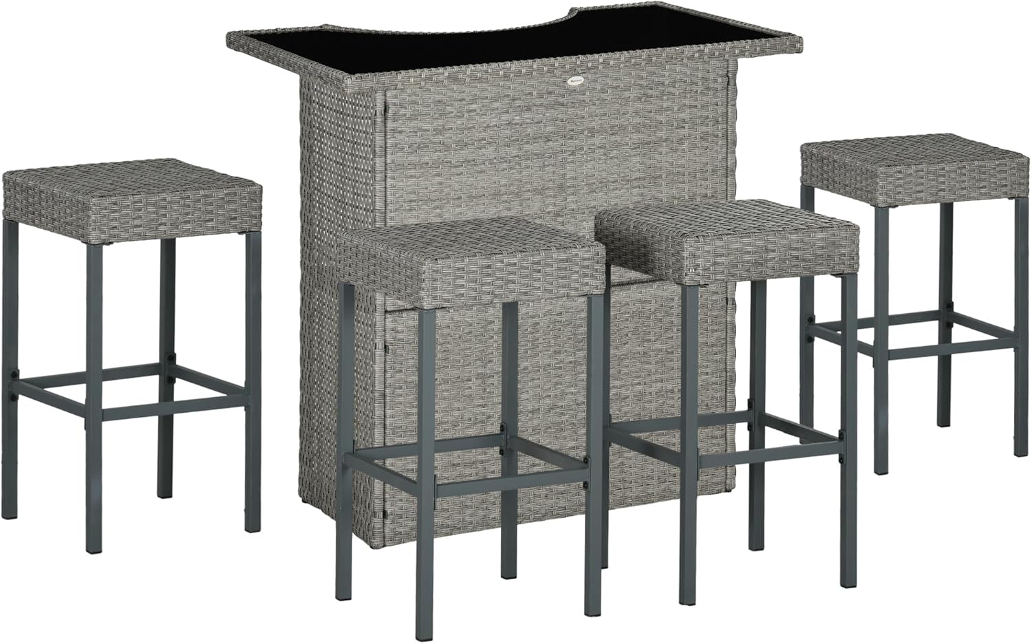 5-Piece Gray PE Rattan Outdoor Bar Set with Glass Table & 4 Stools