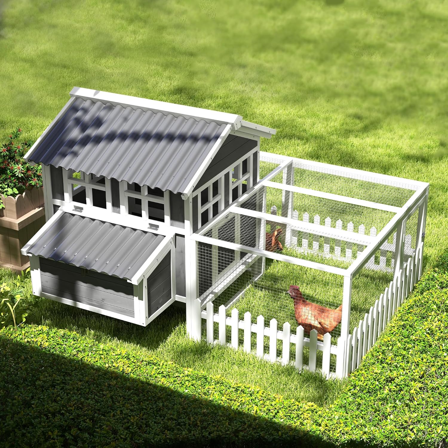- Complete Kit: Your poultry can lay eggs in the nesting box. There are two roosting bars inside the main house, and it includes a decorative fence, making our chicken/ duck house a stylish accent for your backyard.