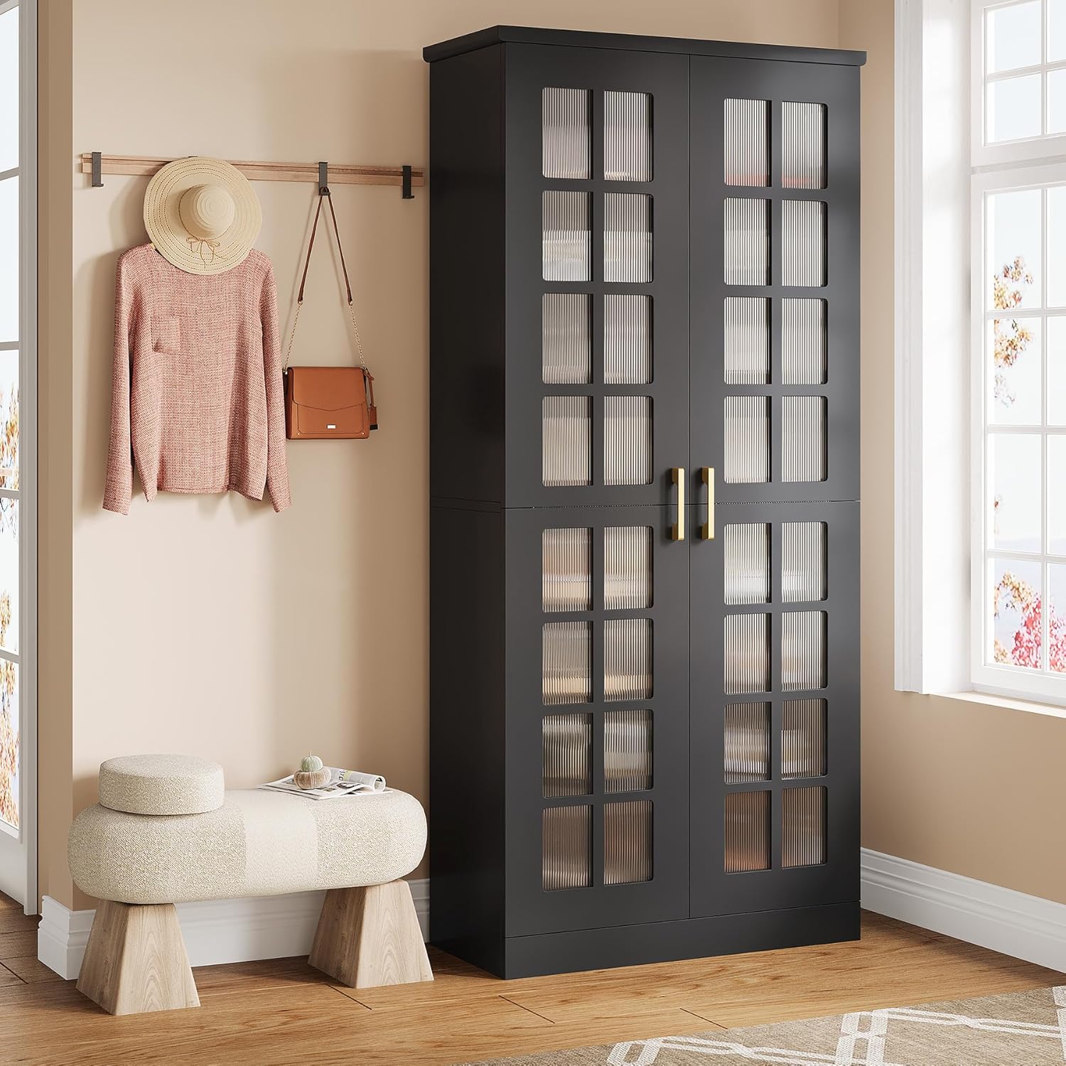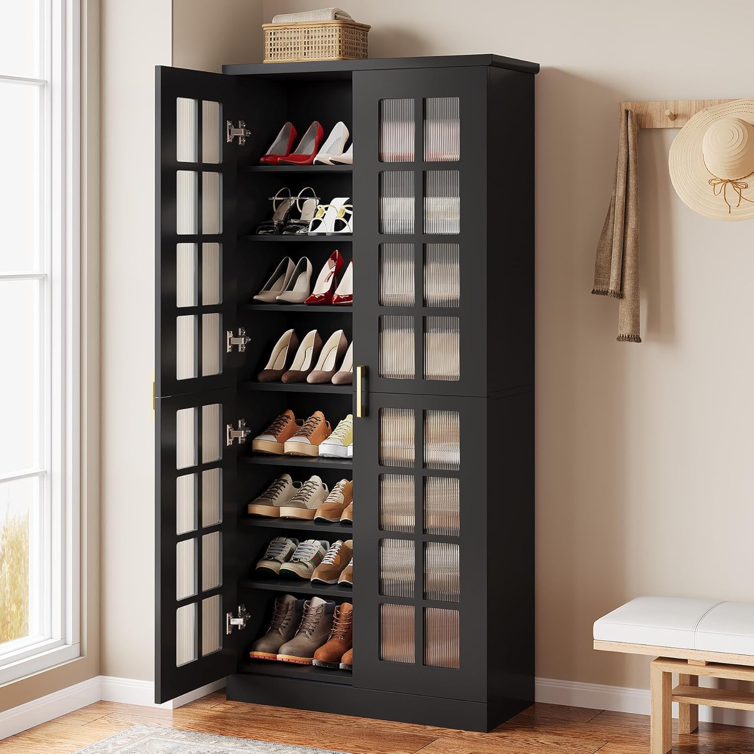- Flexible and Large Capacity: This 8-tier black shoe cabinet, with its adjustable panels and dimensions of 31.5" W x 13.8" D x 70.9" H, simplifies shoe organization and can accommodate up to 32 pairs, ranging from slippers to boots