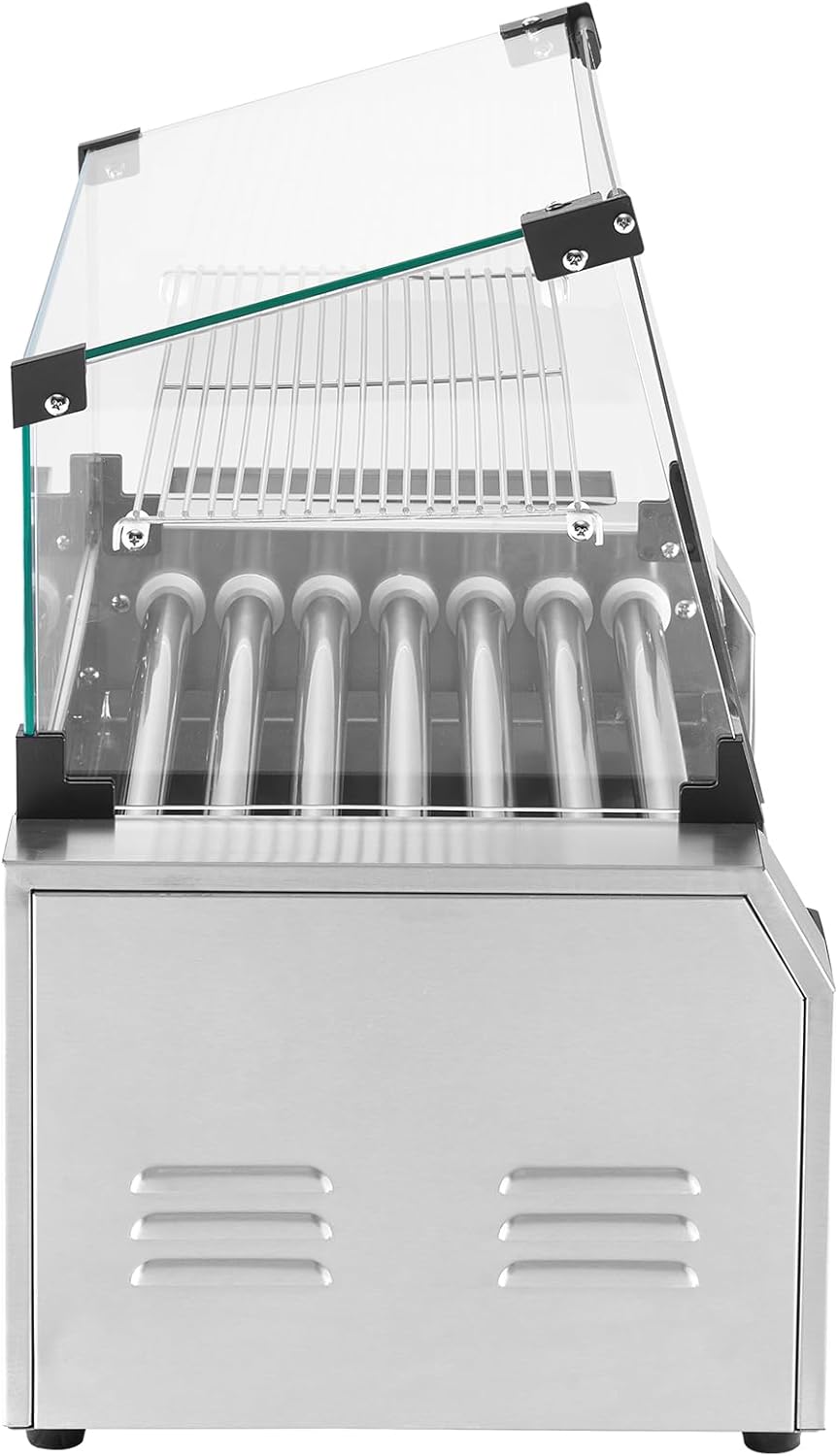• Built to Impress & Last: Built with a durable, sleek stainless steel frame, this commercial hot dog roller provides not only a modern look but also long-lasting performance. The glass hood is offered to block dirt and keep food warm, thus shortening cooking time. The removable drip tray keeps your kitchen clean and washing to a minimum