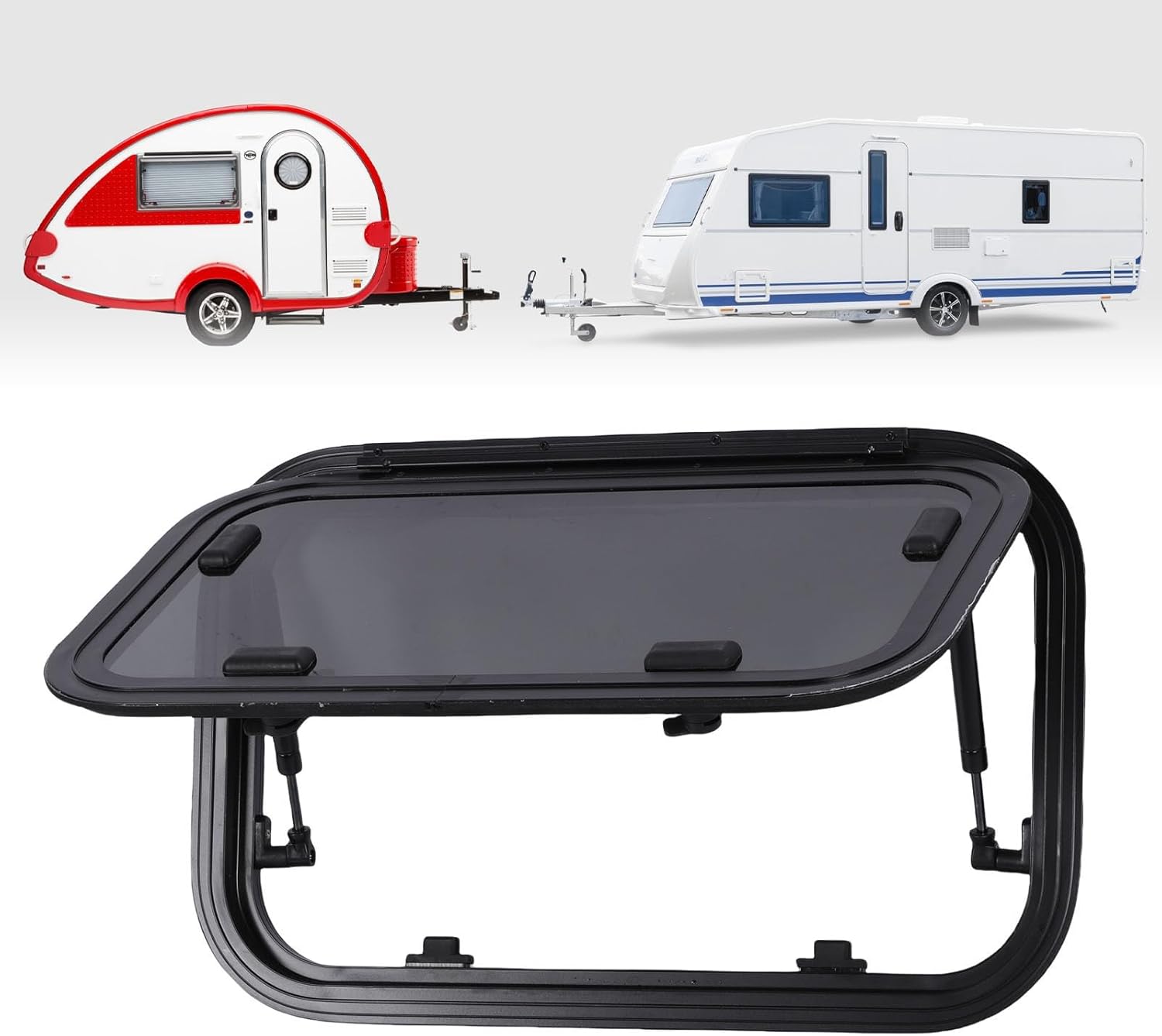 High-end motorhome exit window is equipped with an aluminum alloy frame, tempered glass, sliding emergency exit window, featuring a mesh protective screen and sunshade curtain. It is suitable for motorhomes, camper vans and trucks, with a size of 540x340
