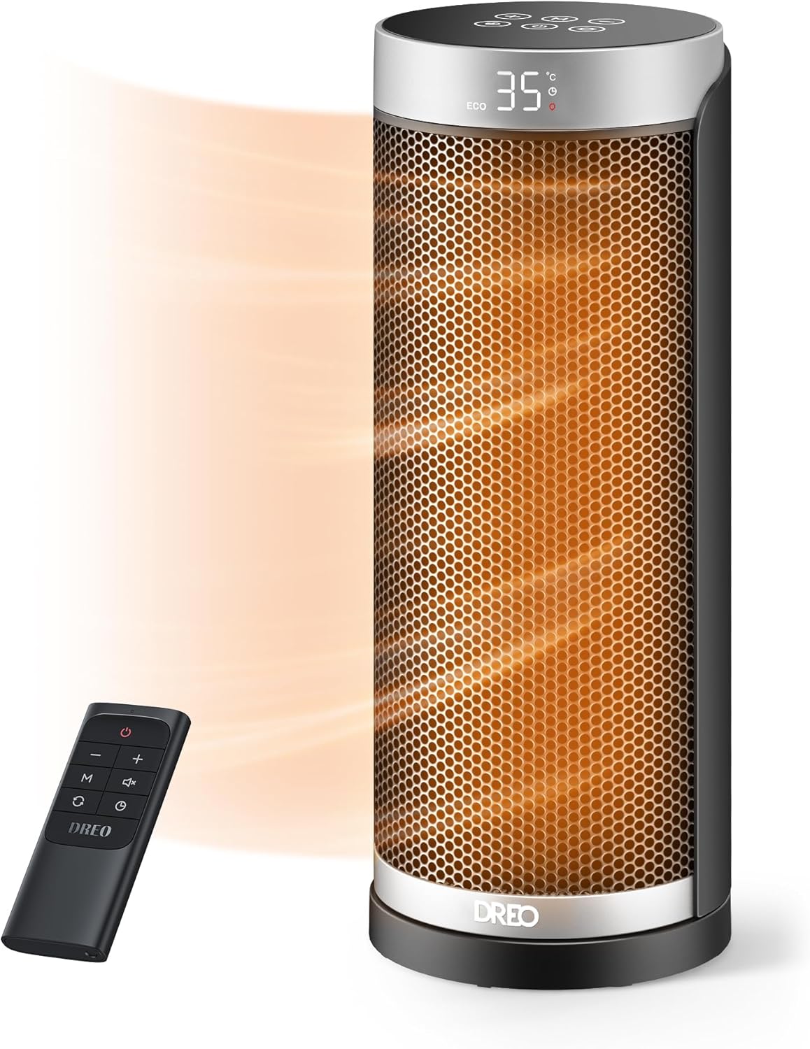 16-inch portable electric heater with remote control function, suitable for bedrooms. A 1500-watt PTC ceramic rapid heater with a thermostat, featuring overheat and tip-over protection, 70° swing, and a 12-hour timer.