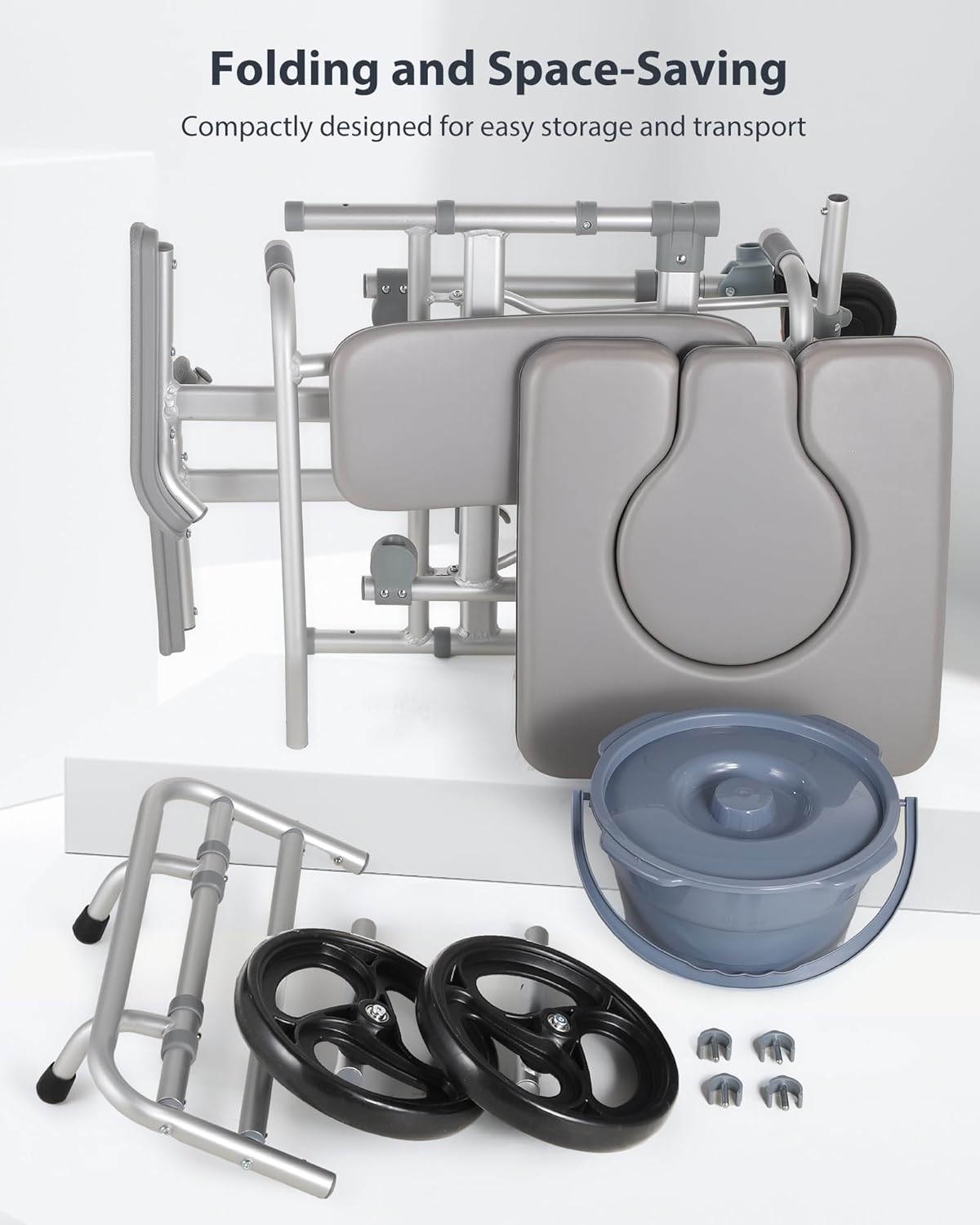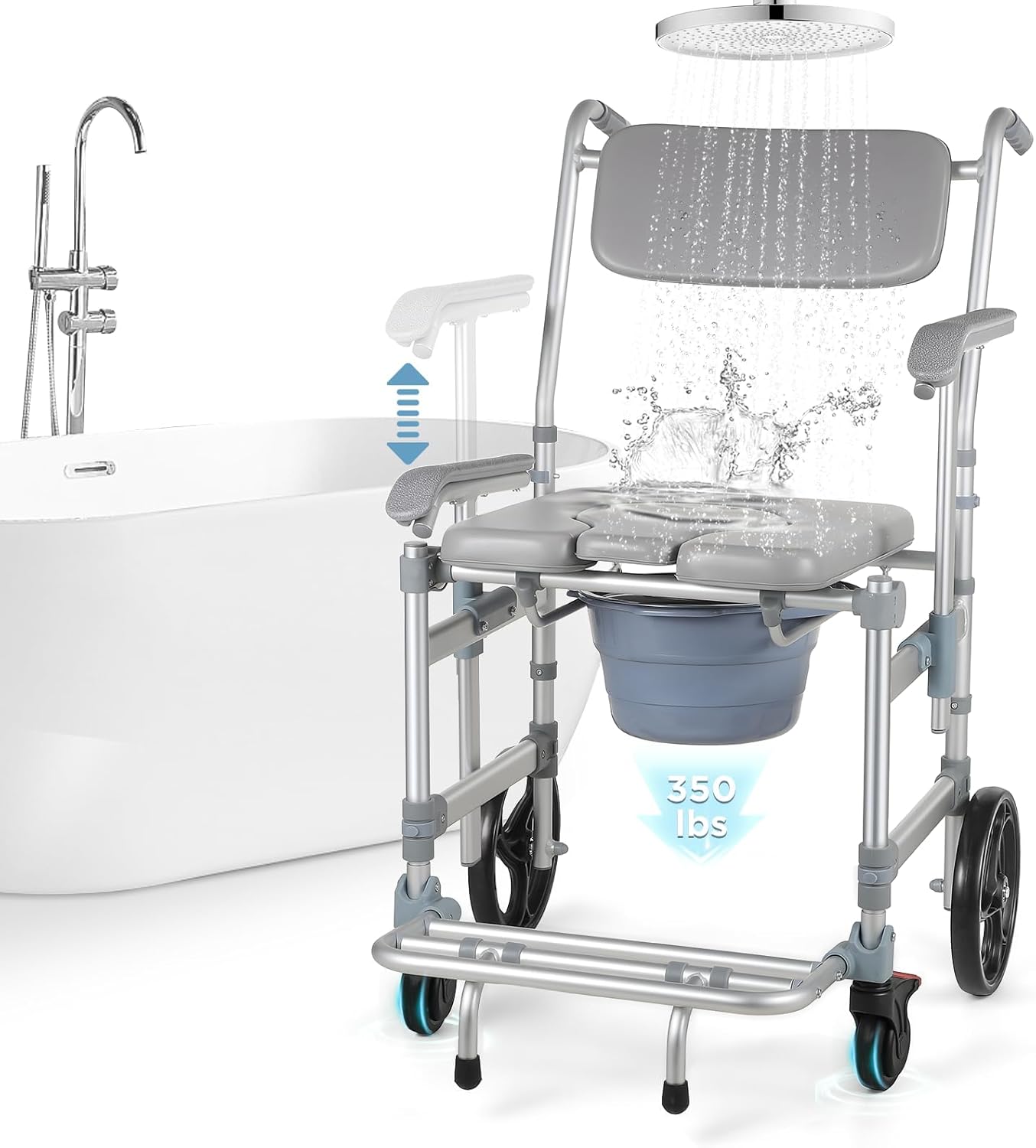 Bariatric Rolling Shower Chair: 4 in 1 Folding Bath Commode Chair for Handicap, Elderly & Injured, Adjustable Armrests for Easy Transfer | Waterproof & Soft | 360° Locking Wheels | 350lbs