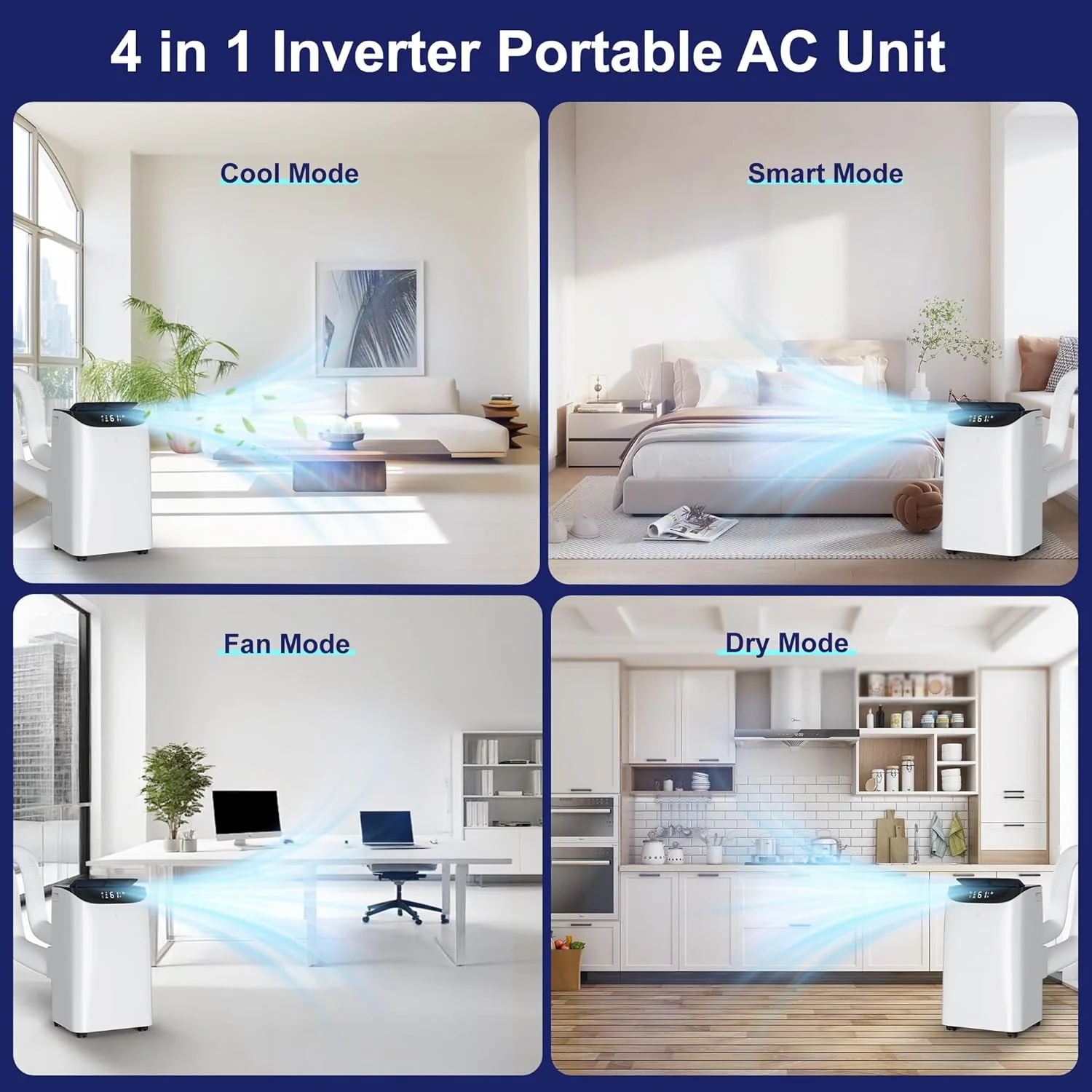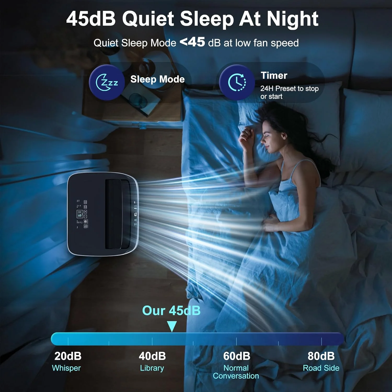- 【Smart & Sleep Mode with 24H Timer for Enery Saving】 Built-in internal temp-sensor. Smart Mode enables the inverter ac unit run in Cool or Fan mode based on the room temperature. Keep the room at the most comfortable temperature 73F-77F. Sleep Mode will maintain an optimal temperature in low speed. and provide you less than 48dB quiet bedroom. You can also preset to stop the ac unit after 0.5-24 hours. all these funtional modes are money-saving and let you have a suitable temperature for relaxation and good sleep in the wonderful summer.