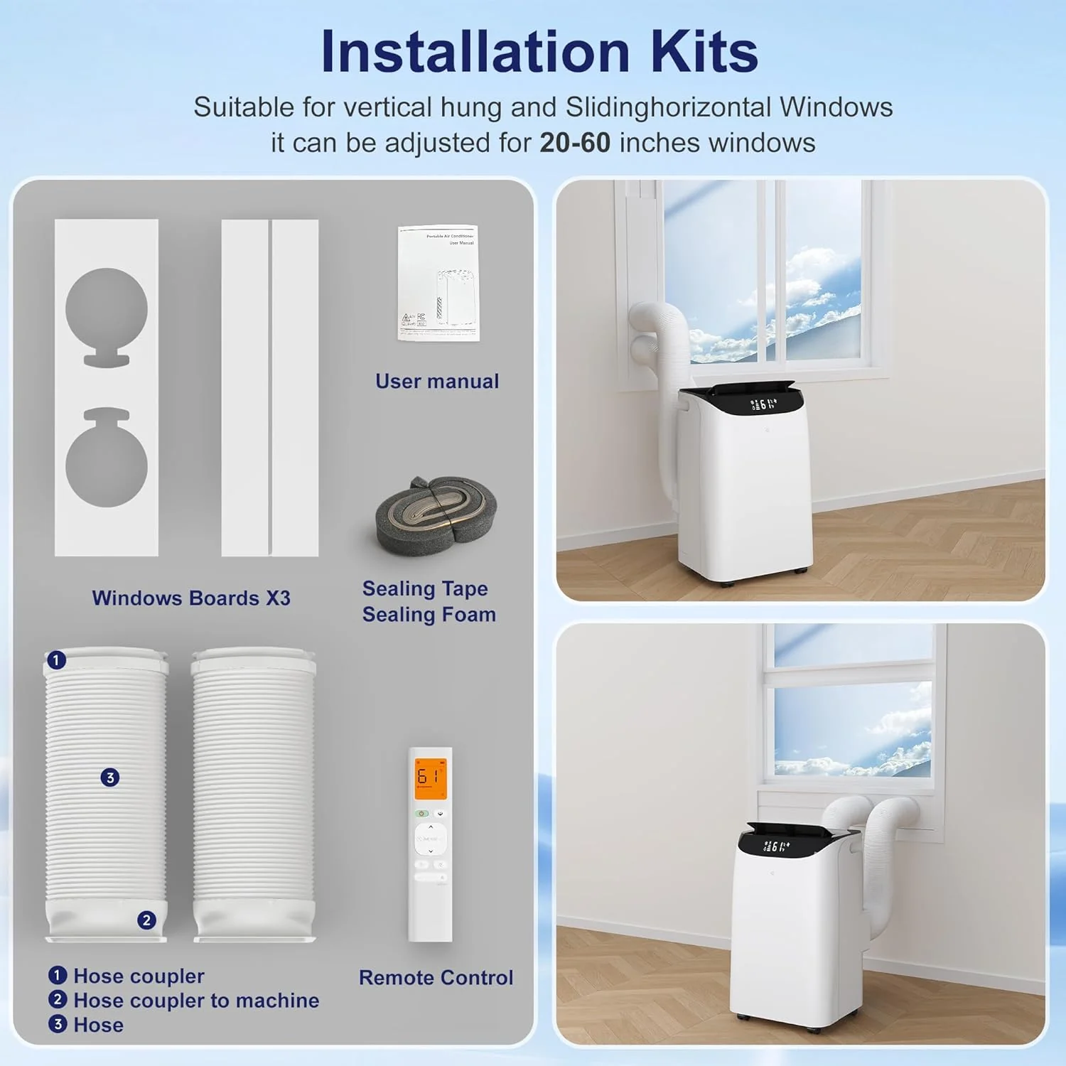 - 【Easy to Move & Install】 Our floor free stand up air conditoning machine comes with four 360° heavy-duty wheels and hidden handles on both sides so you can easily move the machine to any room. Windows sealing kit and exhaust hose are included in the portable ac package to ensure simple installation. and fit most vertical window and horizontal windows. Easy 3 steps to install: First attach the sealing boards to the window. Step 2 insert adapters of the exhaust hose to air conditioner and windows board. Step 3 plug in and enjoy the cooling air.