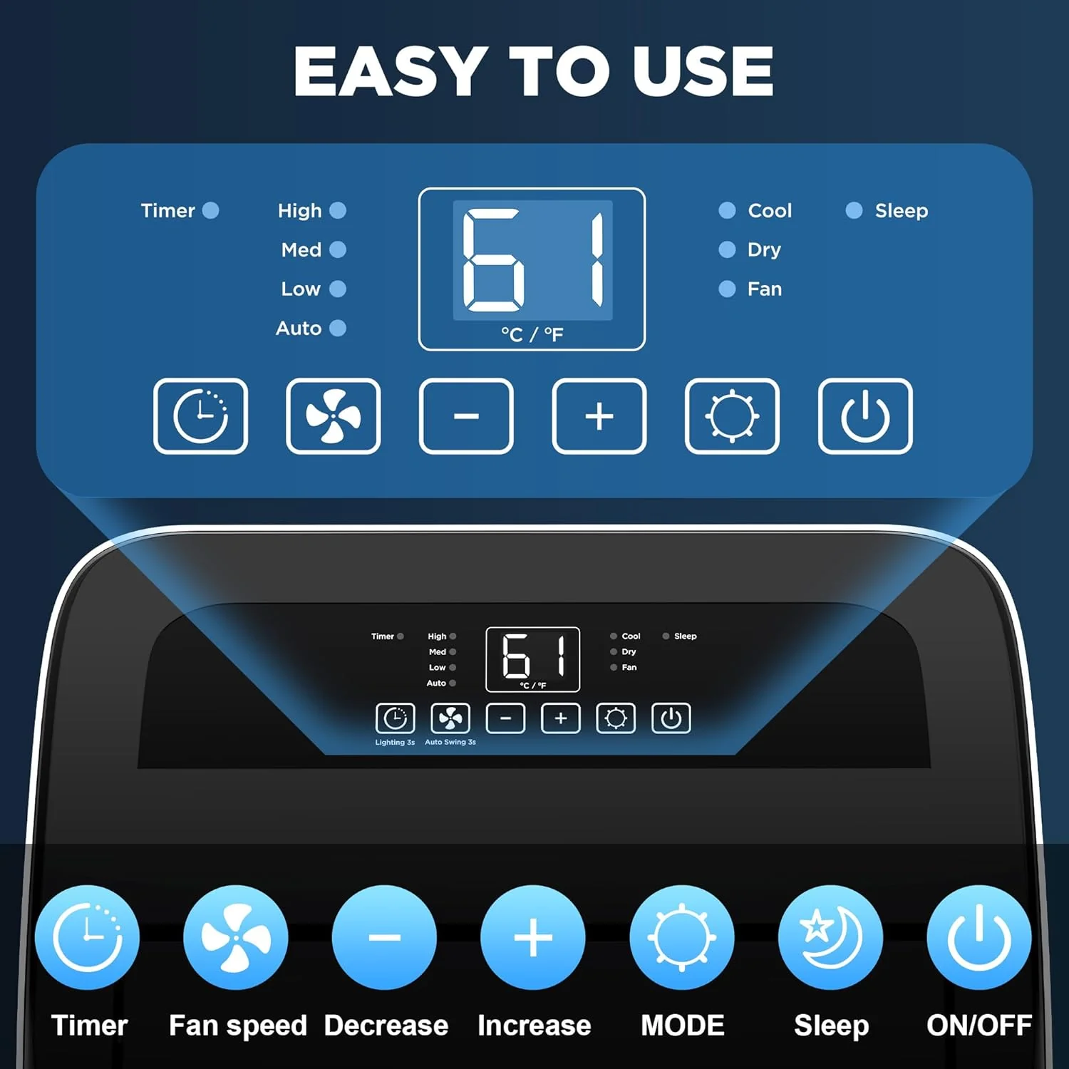 - 【℉ or ℃ Temp Display Easy Switch】When the appliance is running. hold on " - " / " + " button on the touch control panel together 3 seconds by the same time. or long press Swing Angle button for 5 seconds on the remote control. then you can easy switch LED Display of Temperature between Fahrenheit℉ and Celsius ℃. As long as you do not remove the battery from the remote control. all your settings will be saved; Remote control settings also take priority over touch panel settings.