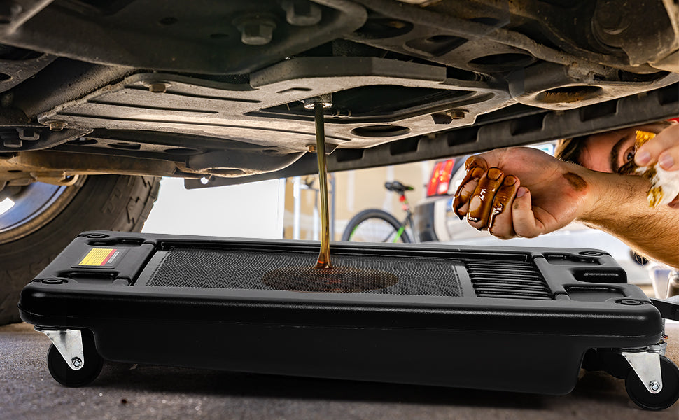3-MINS EASY OPERATION Our drain pan features both rigid casters and locking swivel casters for smooth transport. Anti-splash mesh grille can keep your shop clean and safe. Just open the oil valve of the car, and then entrust the task to oil drain pan. |