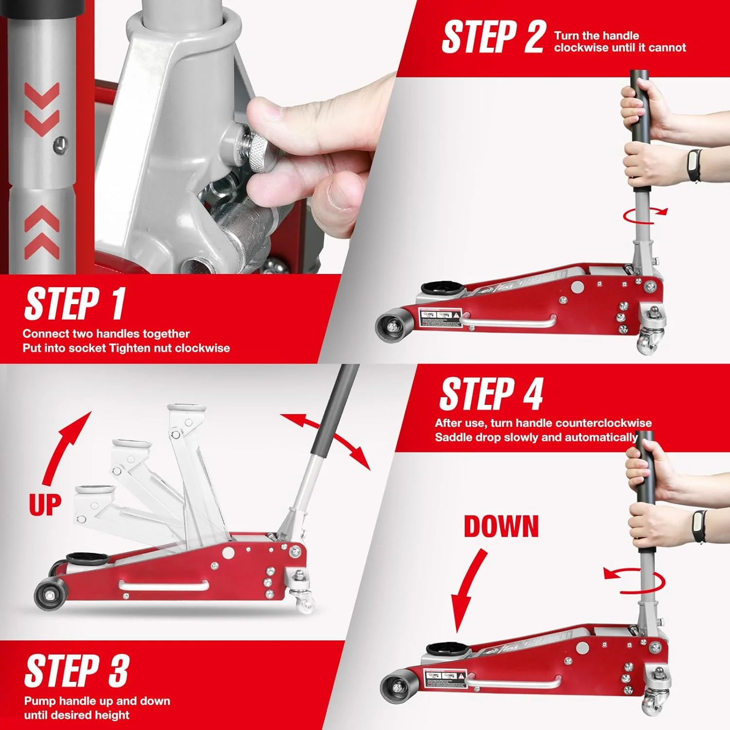 - Quick lifting: Heavy duty jack with dual piston enable you to easily pump the jack to the desired height.Large rubber saddle also help protect your vehicle