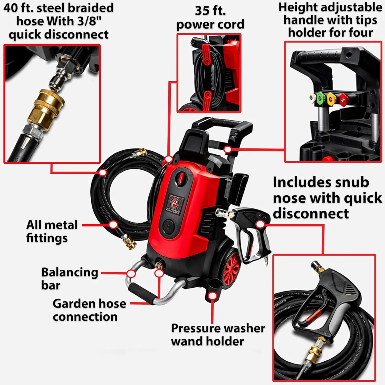 - UPGRADED FEATURES FOR PROFESSIONAL CLEANING - This electric power washer comes with a 40-foot steel braided hose. snub nose trigger sprayer nozzle. and brass inlet water connection. making it a powerful tool for professional cleaning right out of the box.