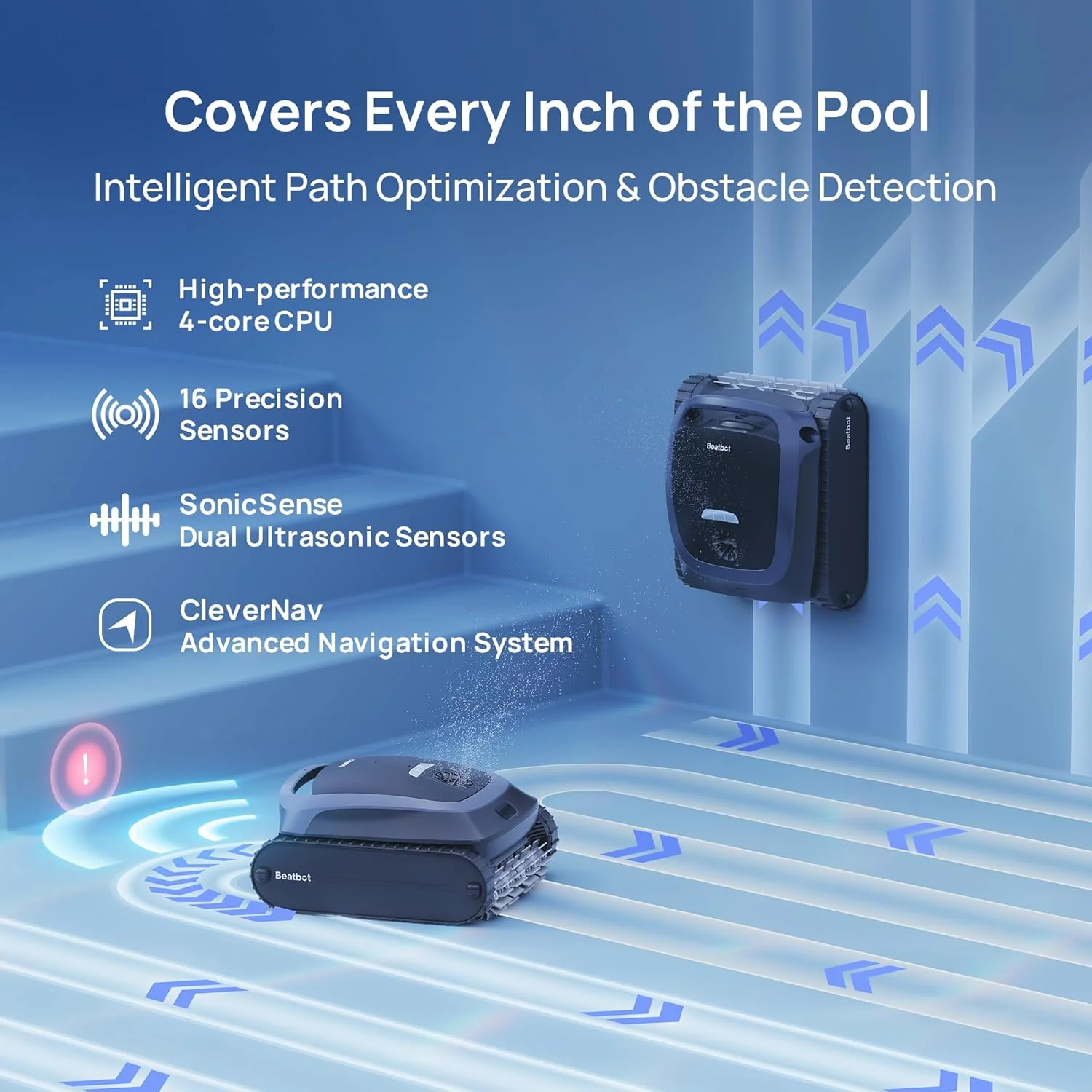 - Full Coverage with Intelligent Path OptimizationCleverNav advanced navigation. powered by a 4-core CPU and 16 sensors (including 2 ultrasonic). adapts to your pools shape. It uses an optimized S-path for floors and an N-path for walls and the waterlinemaximizing coverage and minimizing missed spots.