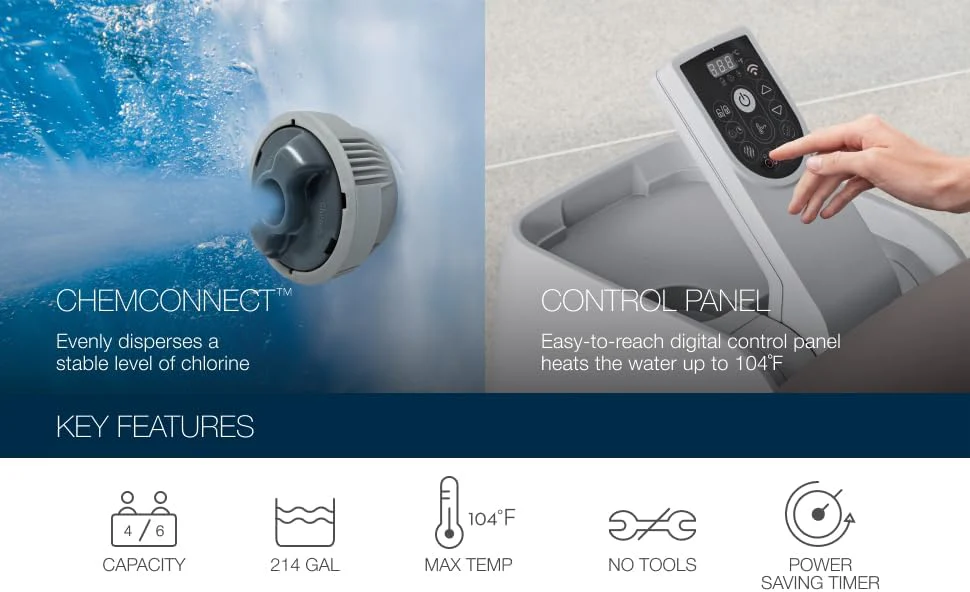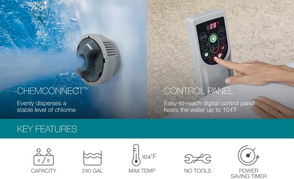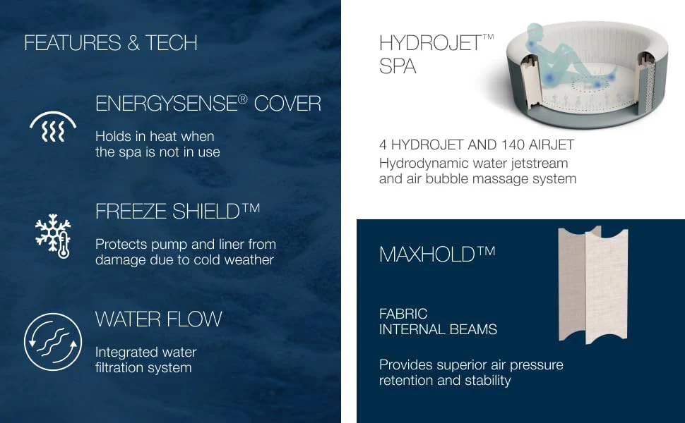 - 40% MORE ENERGY EFFICIENT: The specially constructed EnergySense insulated cover is 40% more energy efficient than similar inflatable spas. The cover prevents debris from collecting and retains heat more efficiently. meaning the water stays hotter and your energy bill stays lower.
