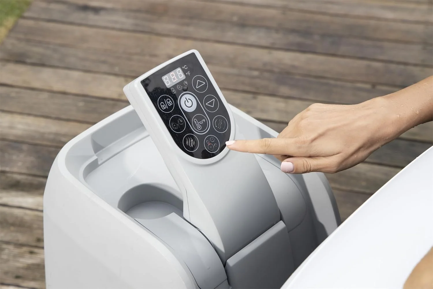 - USER-FRIENDLY DESIGN: The round tub shape is 71" x 26" and fits up to 2-4 persons. making it a great addition to your patio or backyard. The included pump inflates. runs filtration and the AirJet system which can be managed from the digital control panel. It also acts as a tray and cup holder.