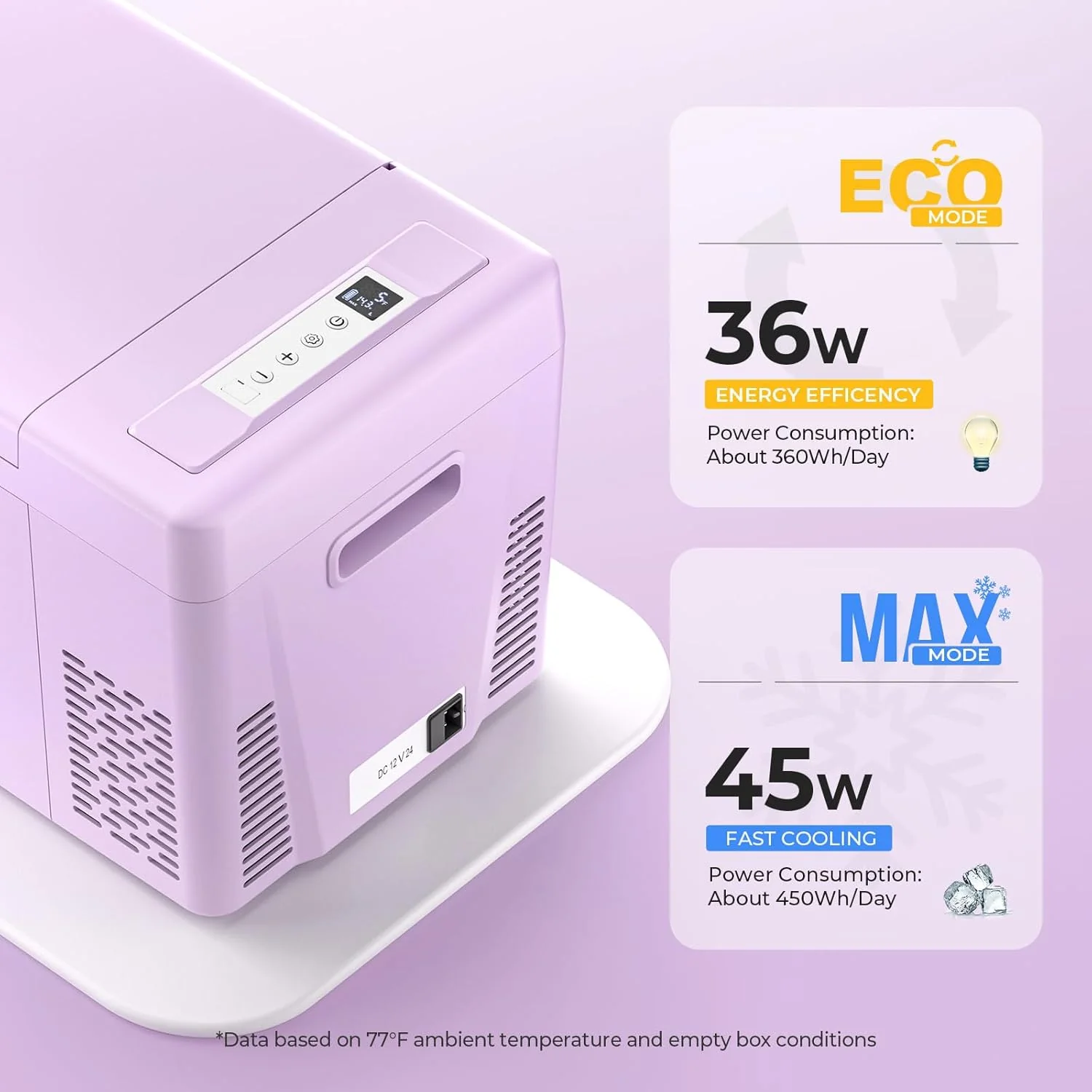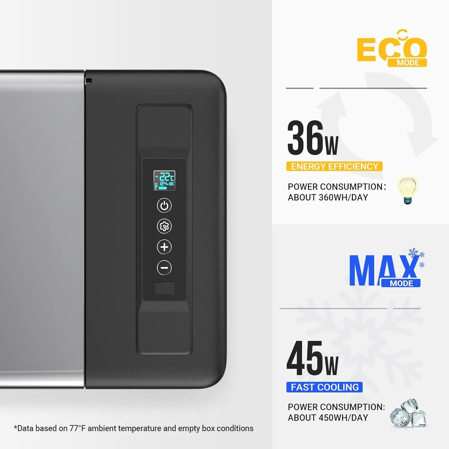 - 45W Low Power Consumption: With ECO energy saving mode. this 23 Qt portable refrigerator's operating power is less than 36W. Even running on MAX mode(45W). it consumes far less than 1kWh/day for its intelligent cycle work. You can run this portable freezer fridge with 12/24V DC power on various vehicles. such as SUVs. Trucks. RVs. Camper. Van. Boat. etc