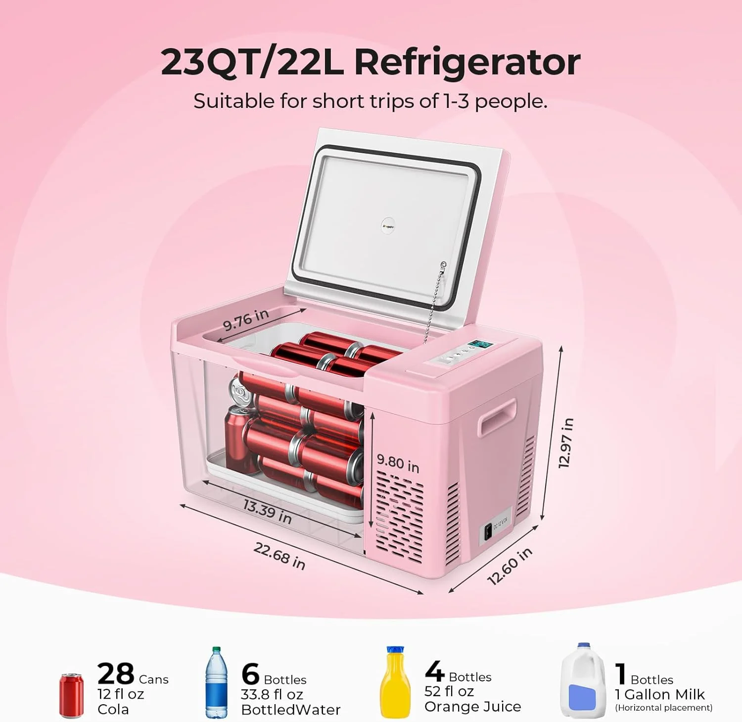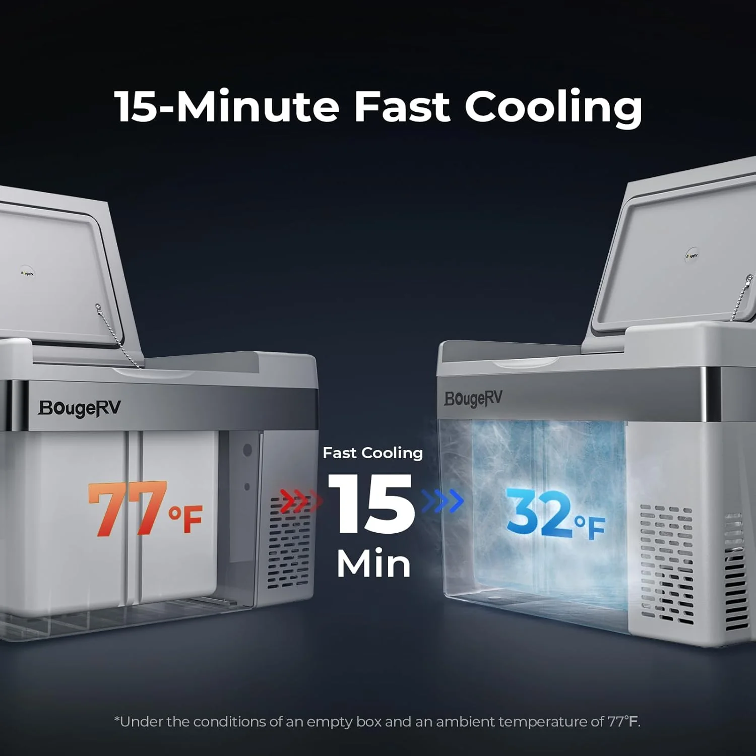 - Fast Cooling Down to 32℉: With Compressor refrigeration technology. this 12v car refrigerator could achieve 15 min fast cooling from 77℉ to 32℉ and 50 min from 77℉ to -5℉. keeping your food fresh. No ice needed. no food spoiled. money and space-saving. Dimension: 22.68*12.60*12.97 in. Weight: 22.27 lb. lightweight
