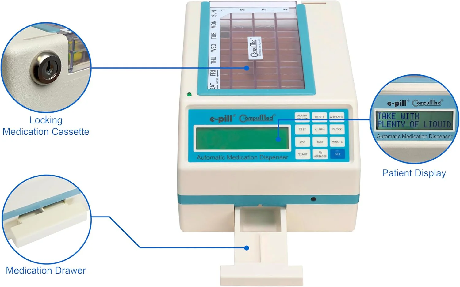 Assures Peace of Mind: the Right Amount of the Right Medication at the Right Time, Every Time. Dispense up to Four Times a Day. Week after Week Without Fail. Tamper Resistant / Locked e-pill Automatic Medication Dispenser with Loud Alarm.