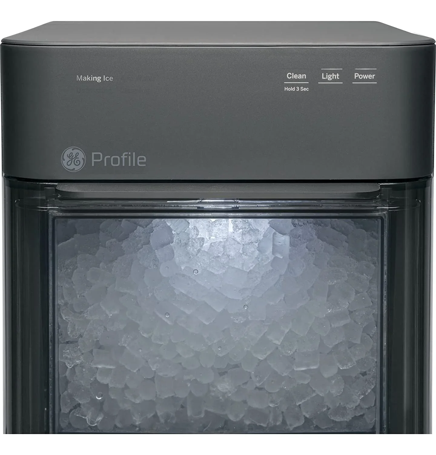 Opal Nugget Ice. is The Good Ice! Our nugget ice is chewable. crunchy. and airy in texture – because it's made from compacted ice flakes! Our modern style countertop nugget ice maker is developed to avoid ice clumps and produces one pound of fresh ice per hour and has a large-capacity bin that holds up to 48 ounces of crunchable nugget ice – that's 24 pounds of ice per day. Begin enjoying your first batch of ice in 20 minutes or less with the rapid production of this countertop ice maker. Innovative design and cutting-edge details enhance this clean. modern style ice maker. Easily pair your ice maker's built-in WiFi with the SmartHQ™ app to monitor device status and schedule fresh ice. Plus. receive automatic software updates and access voice control capabilities through Alexa and Google. LED display screen illuminates while being used and goes dark when at rest. providing distraction-free functionality that fits your home.