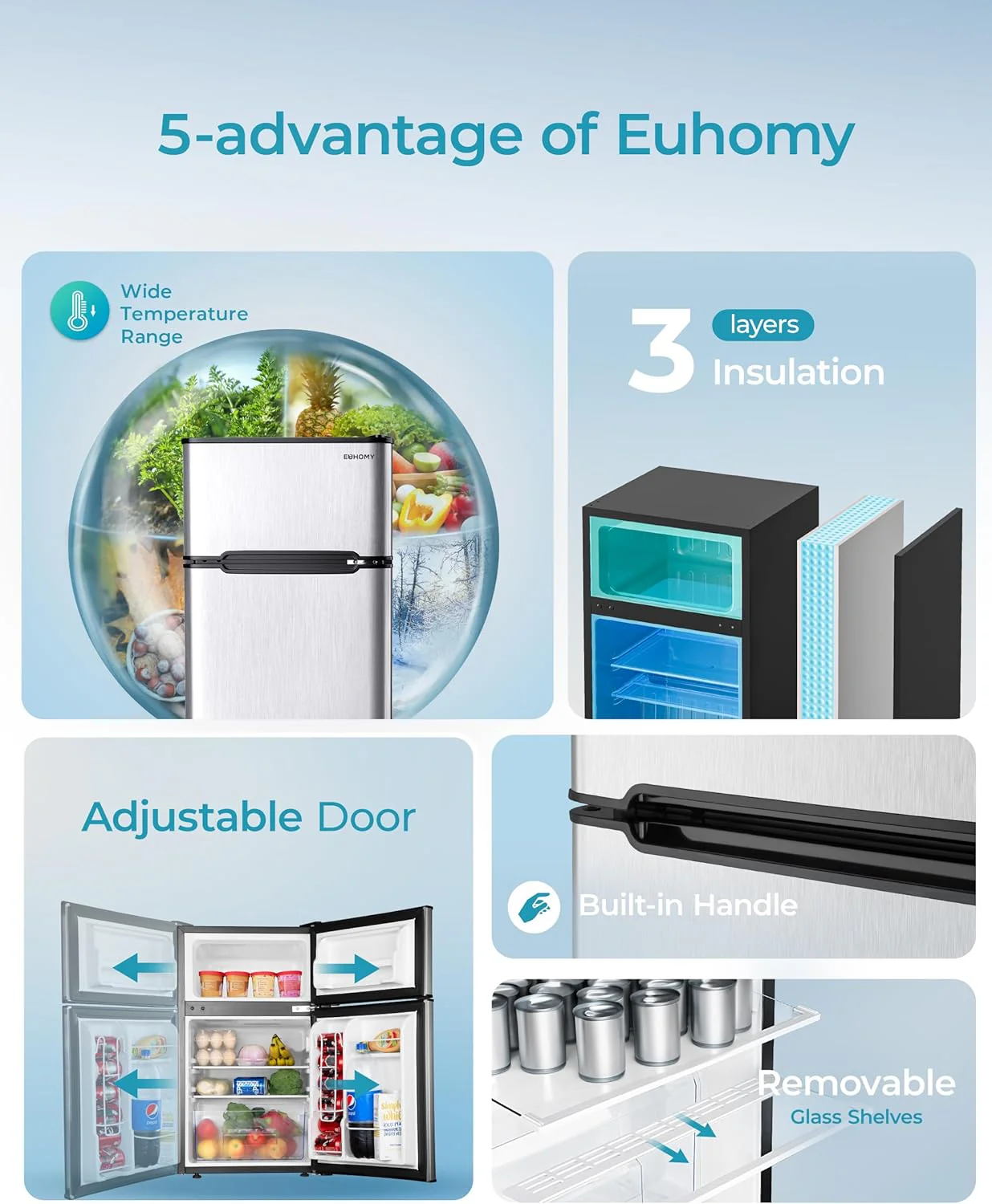 • EVERYTHING IS SIMPLE AND EASY - Euhomy designed LED lights inside dorm fridge with freezer Even if you turn on small refrigerator at night. you can still see the inside of the refrigerator very clean. The multi-layer shelves and crisper drawer of the compact refrigerator with freezer completely help you solve the problem of food odor. You can put them in shelves or crisper drawer according to the type or size of the food. The shelves are adjustable. Everything is to help you have more options