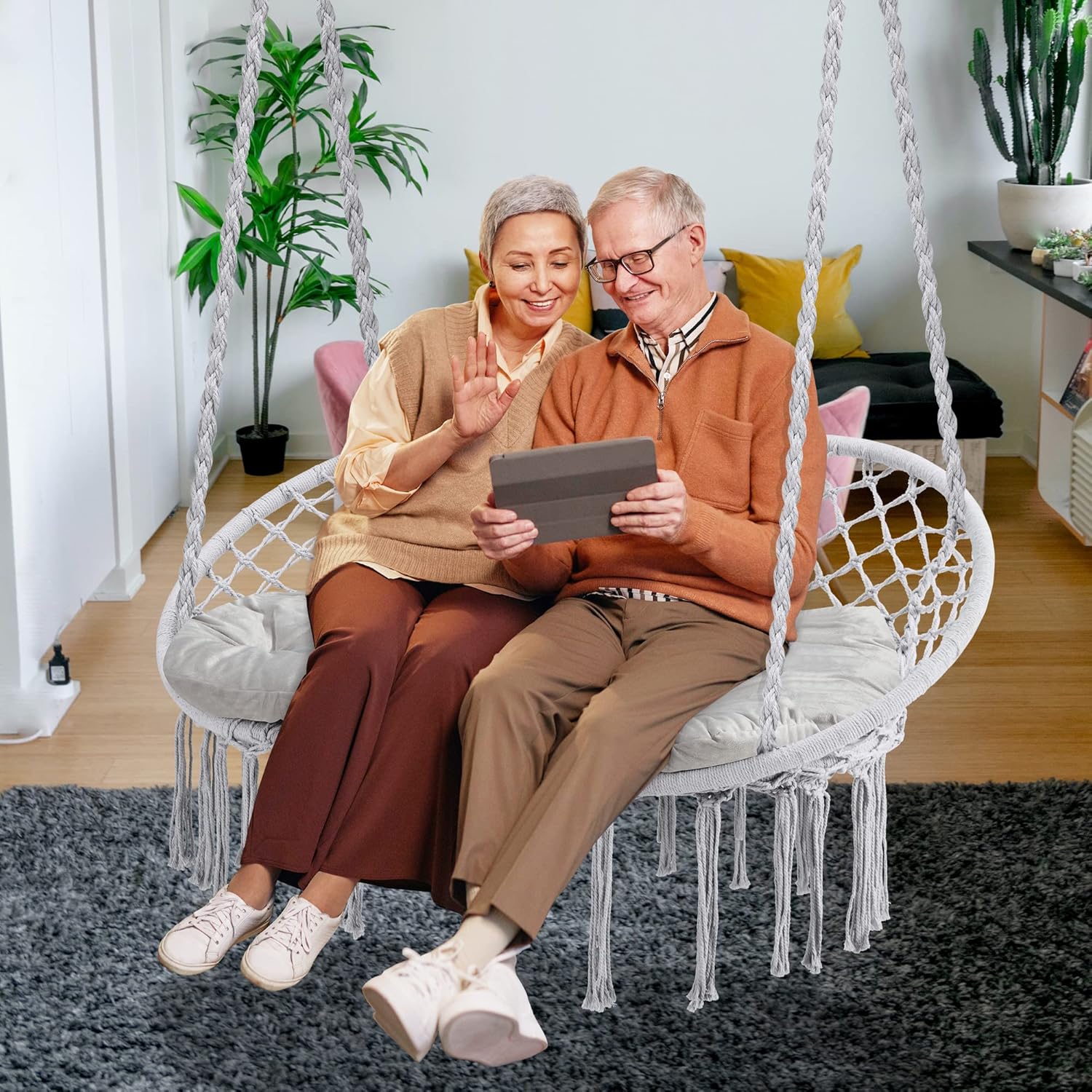 • Hammock Chair Macrame Hanging Swing with Cushion,Hanging Cotton Ropes, Metal Frame, 450 lbs Capacity Indoor Outdoor, Patio, Balcony, Living,Deck, Yard, Garden(Double Swing) Beige