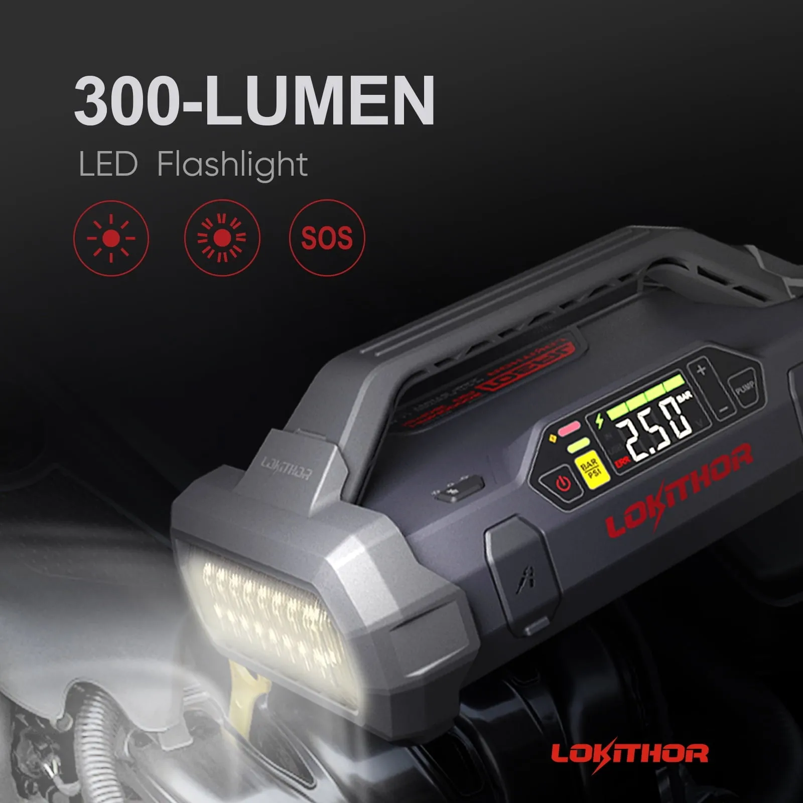 A portable emergency power solution brand designed and manufactured by GREPOW Battery Company (sub-brands: Tattu. Gens Ace). just released the JA301 industry-leading multi-purpose portable device. containing a jump starter. air inflator. LED light as well as power bank function. With a capacity of 74Wh. 20000mAh. 2000A peak current. LOKITHOR JA301 is always your reliable backup. We keep our focus on providing convenient solutions for automotive emergencies. and LOKITHOR JA301 is always your reliable backup.