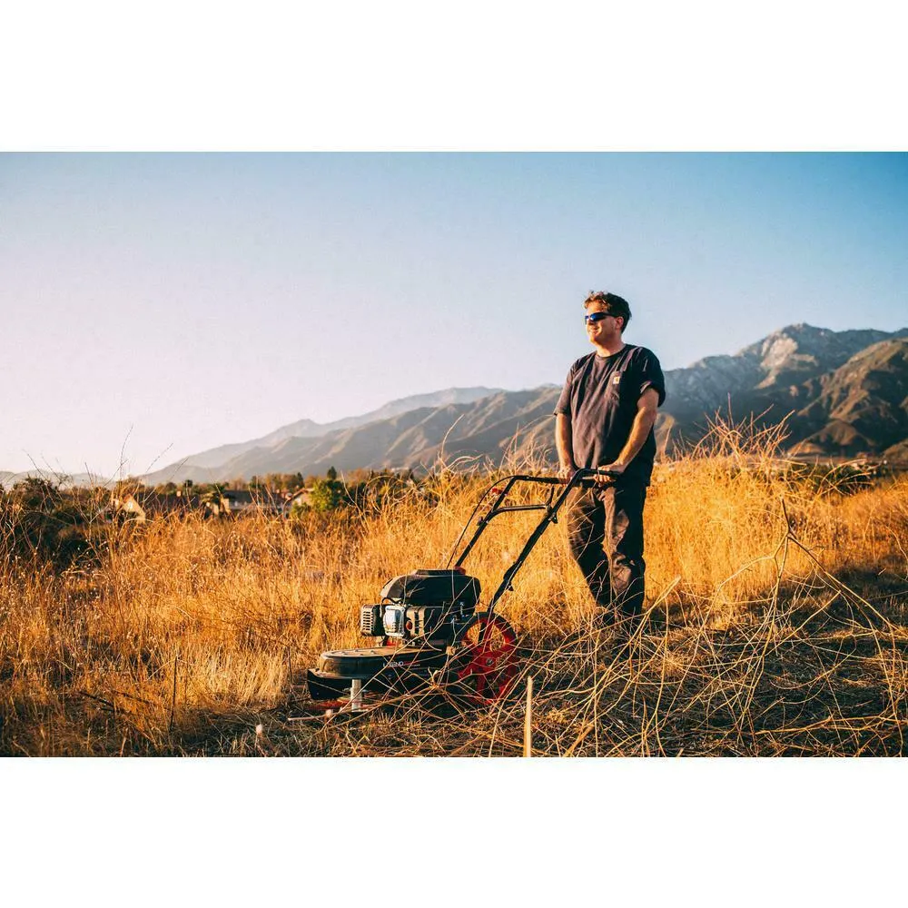 Walk Behind Brush Cutter Gasoline Powered is easy to assemble. easy to start. and ideal for light-to-moderate brush. This powerful brush mower is equipped with a 173cc OHV engine and a manual recoil easy start ignition system. The dual. double-line grass trimmer head provides adjustable 1.575 in. to 3.75 cutting height and a 22 in. cutting swath for greater ground coverage. The 14 in. wheels allow the walk behind gas weed eater to easily handle uneven terrain. After a long day of work. simply fold the handle down for easy storage. The Legend Force walk behind gas weed trimmer is ideal for cutting through deep weeds. brush. and tall grass.