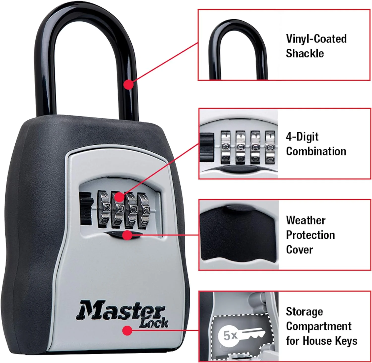 - Large capacity key lock box stores up to 5 house keys; Resettable 4-digit combination provides security
