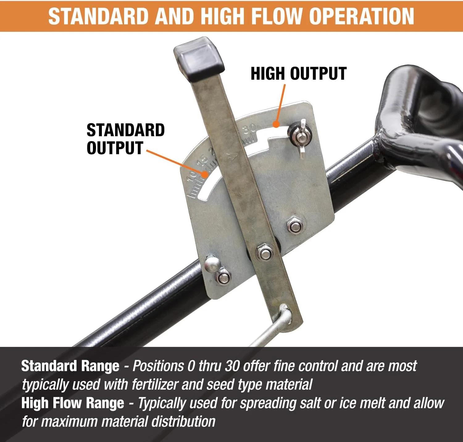 • All Season Walk Behind: This easy to assemble manual salt spreader has a 100 pound capacity so you can cover larger areas using fertilizer and grass seed in the Spring and then switch to bagged salt or ice melt; Adjustable spread range of up to 24 feet