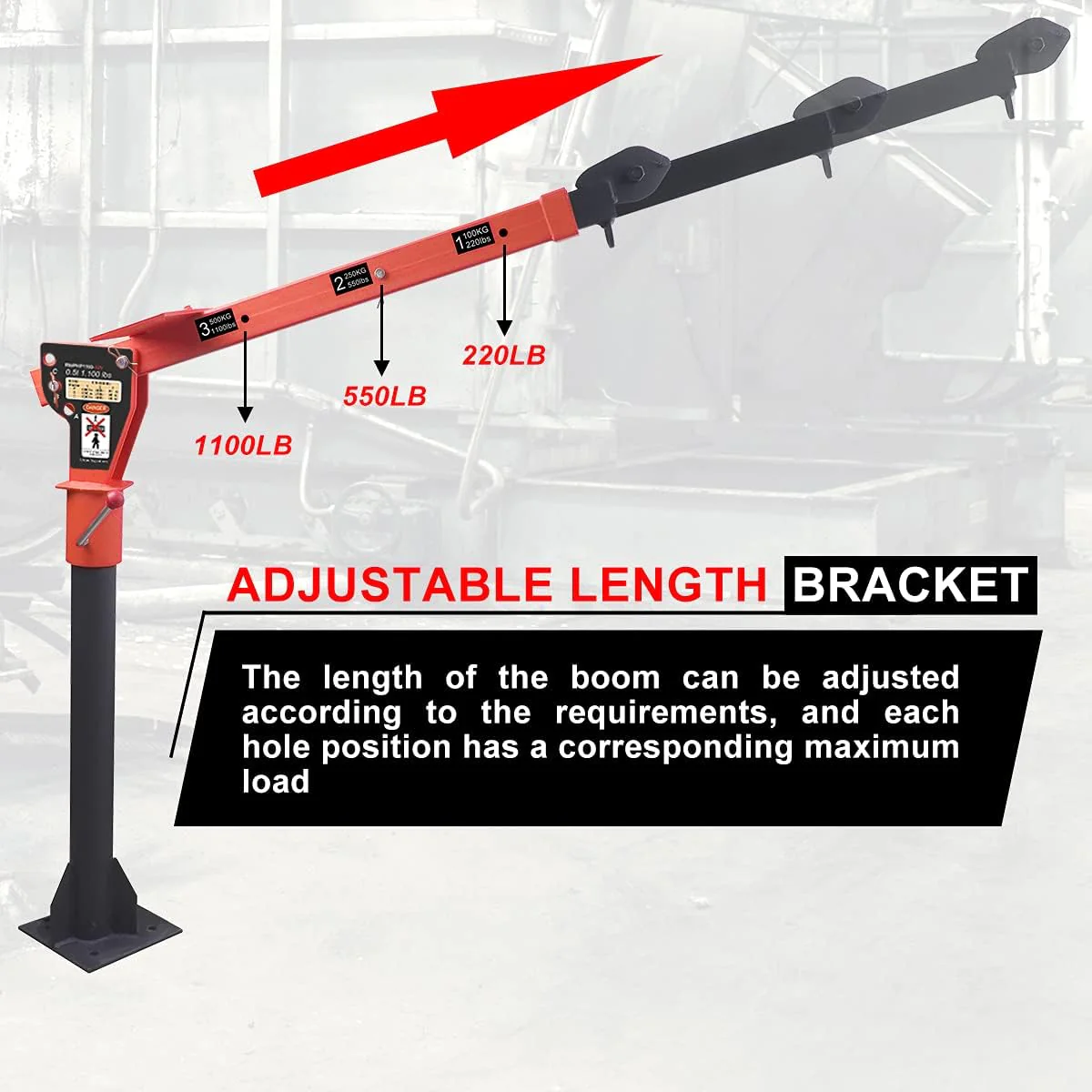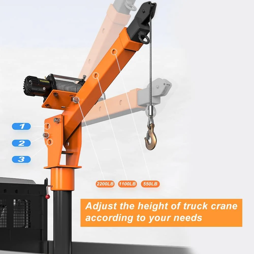- Boom reach: Three boom capacities: 220. 550 and 1100 pounds ; truck crane has boom with adjustable length. which can reach from 46.06" to 57.09" to meet your requirements