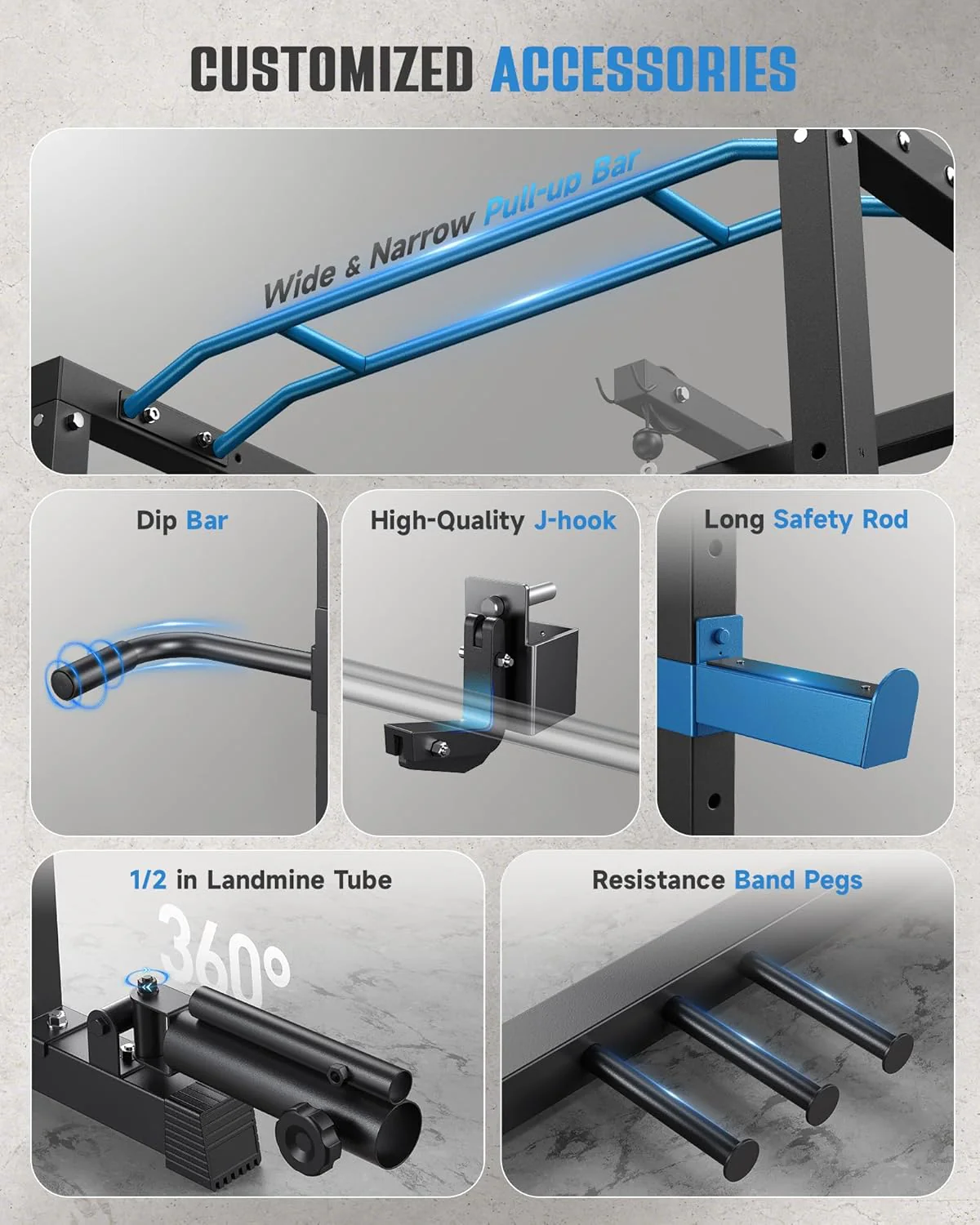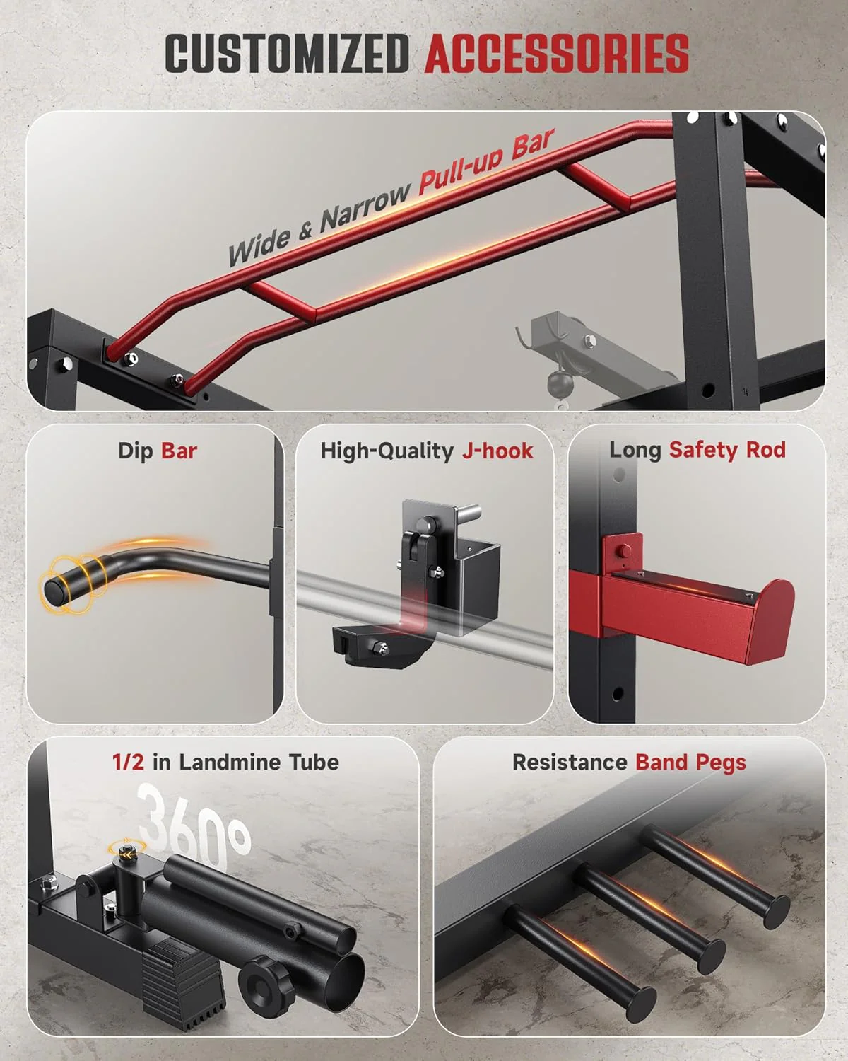 - 【Fully Equipped & Versatile】- No need to buy the extra fitness accessories. All come with Sportsroyals home gym power cage. It included: lat pull-down bar*1. cable bar*1. cable handle*2. J-Hook*2. safety frame*2. safety rod*2. wide&narrow pull-up frame. dip bar*2. 360° landmine*1. foot board*1. band peg*6. 1"&2" barbell clamps*6. In addition. the weight plate storage bracket fits the 2" Olympic or 1" standard weight plates.