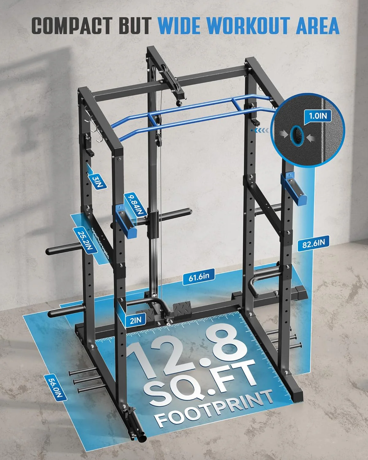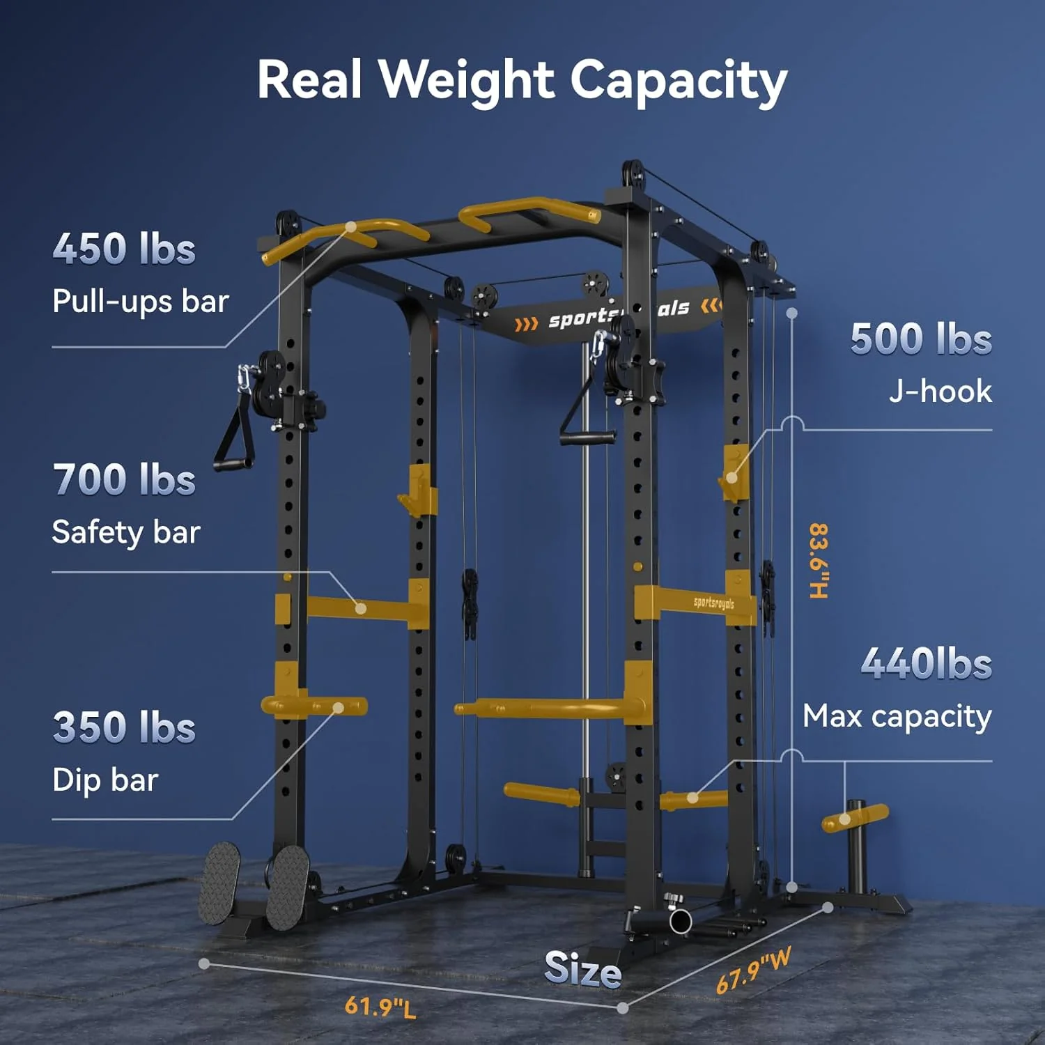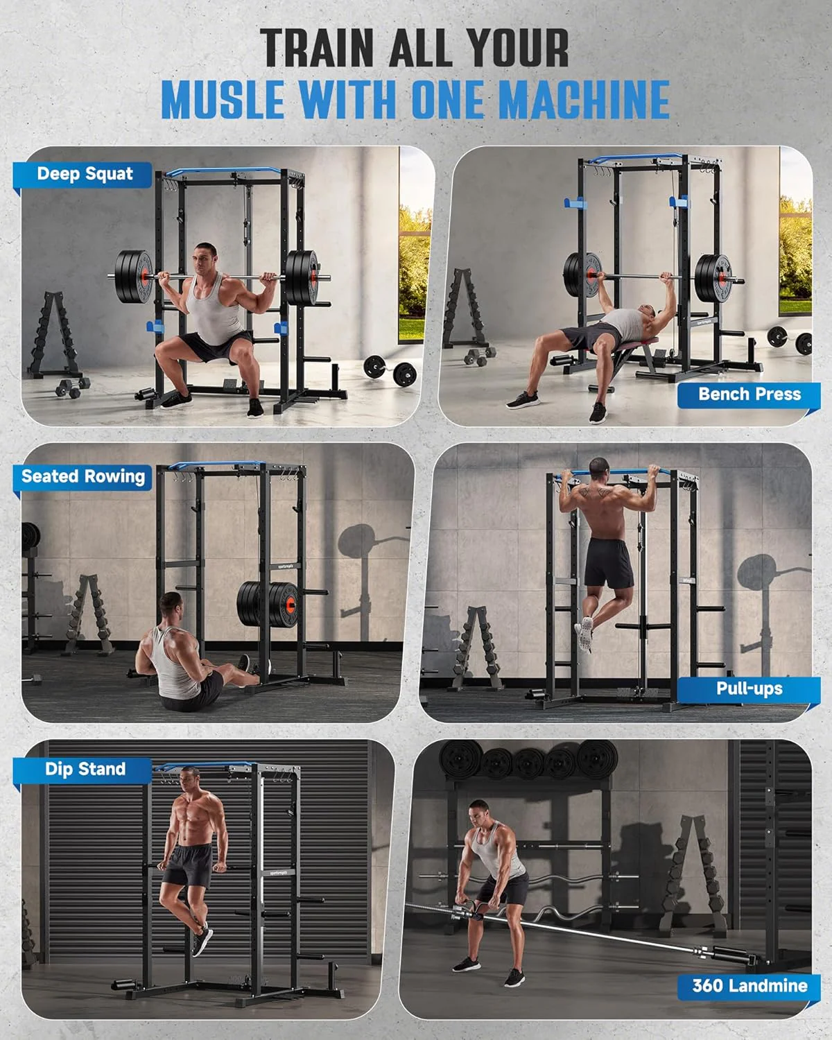 - 【Train all your muscles with one machine】- Sportsroyals power cage combines a squat rack. lat pull-down machine. power tower. dip bar. 14 height adjustable pillars. and other free Accessories. It can free a variety of exercises. for example. wide & narrow lat pull-downs. 360° landmine. seated cable rows. bench presses. squats. dead-lifts. triceps extensions. pull-ups. chin-ups. dips. and more. Train all your muscles with one machine.