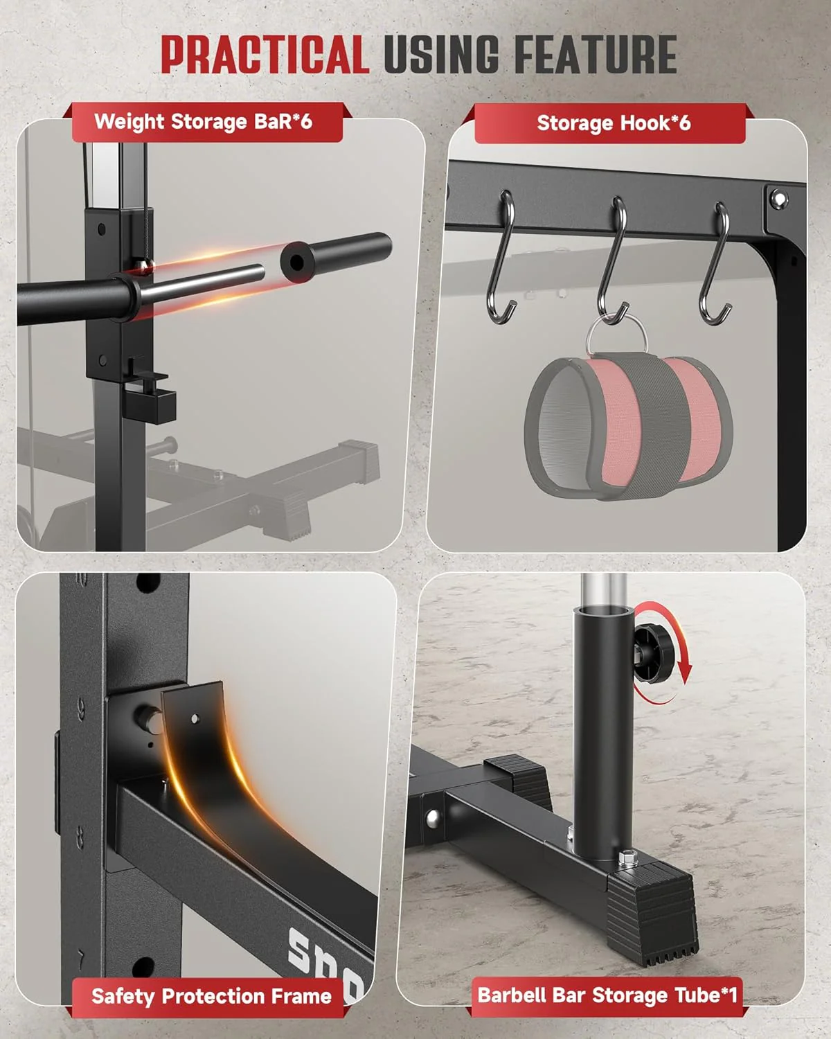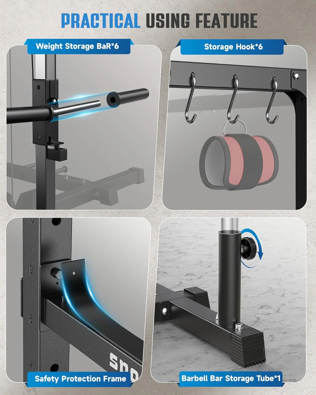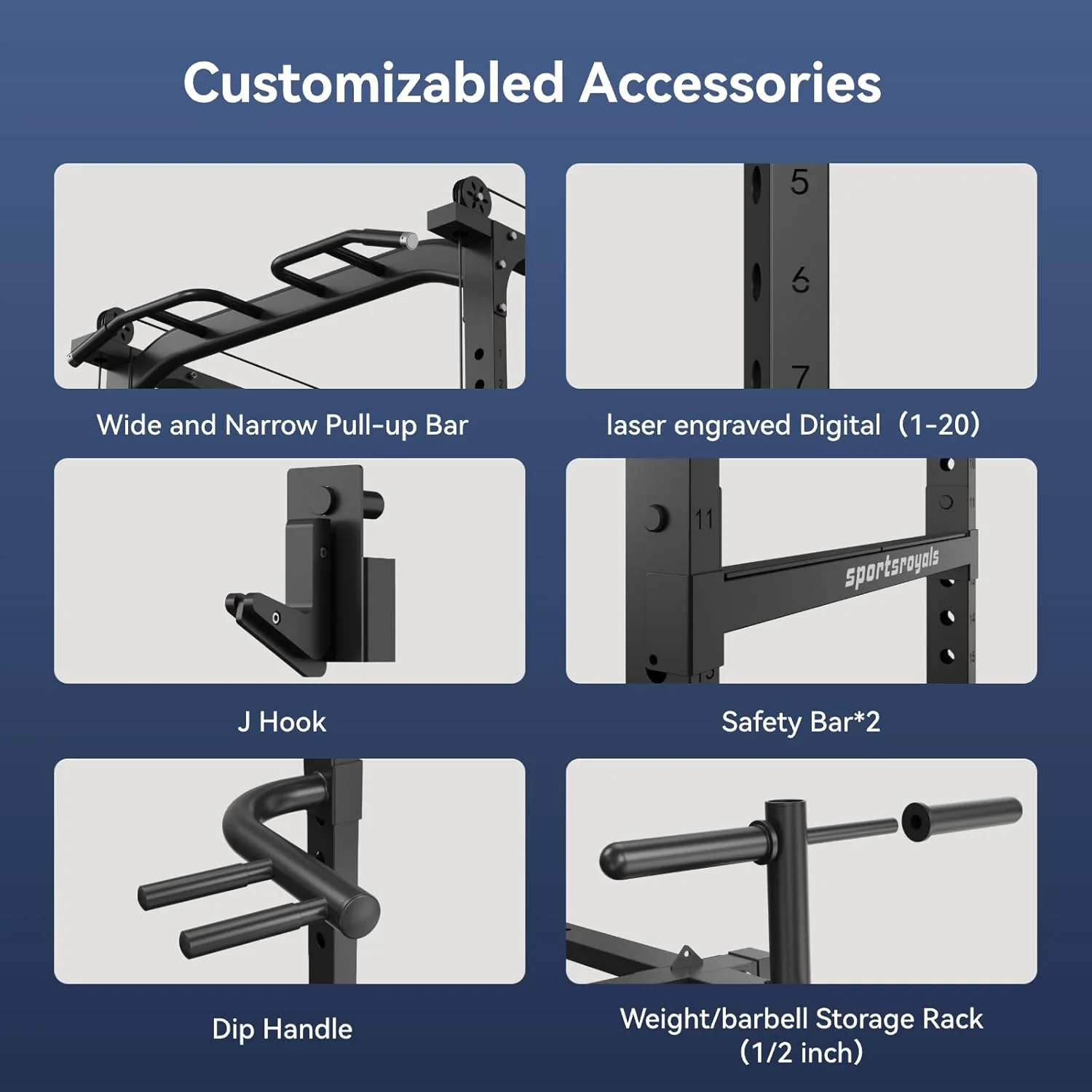 - 【Practical Using Feature】Say goodbye to a cluttered floor. Sportsroyals power rack for home gym is built with 1 barbell bar storage holder. 6 weight storage racks. and 6 handle storage hooks. it can perfectly organize all your gym accessories and weight plates. In addition. the rubber pads on the safety frame and safety rod can provide good cushioning. and ensure the safety of workouts.
